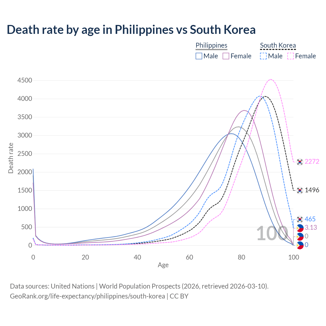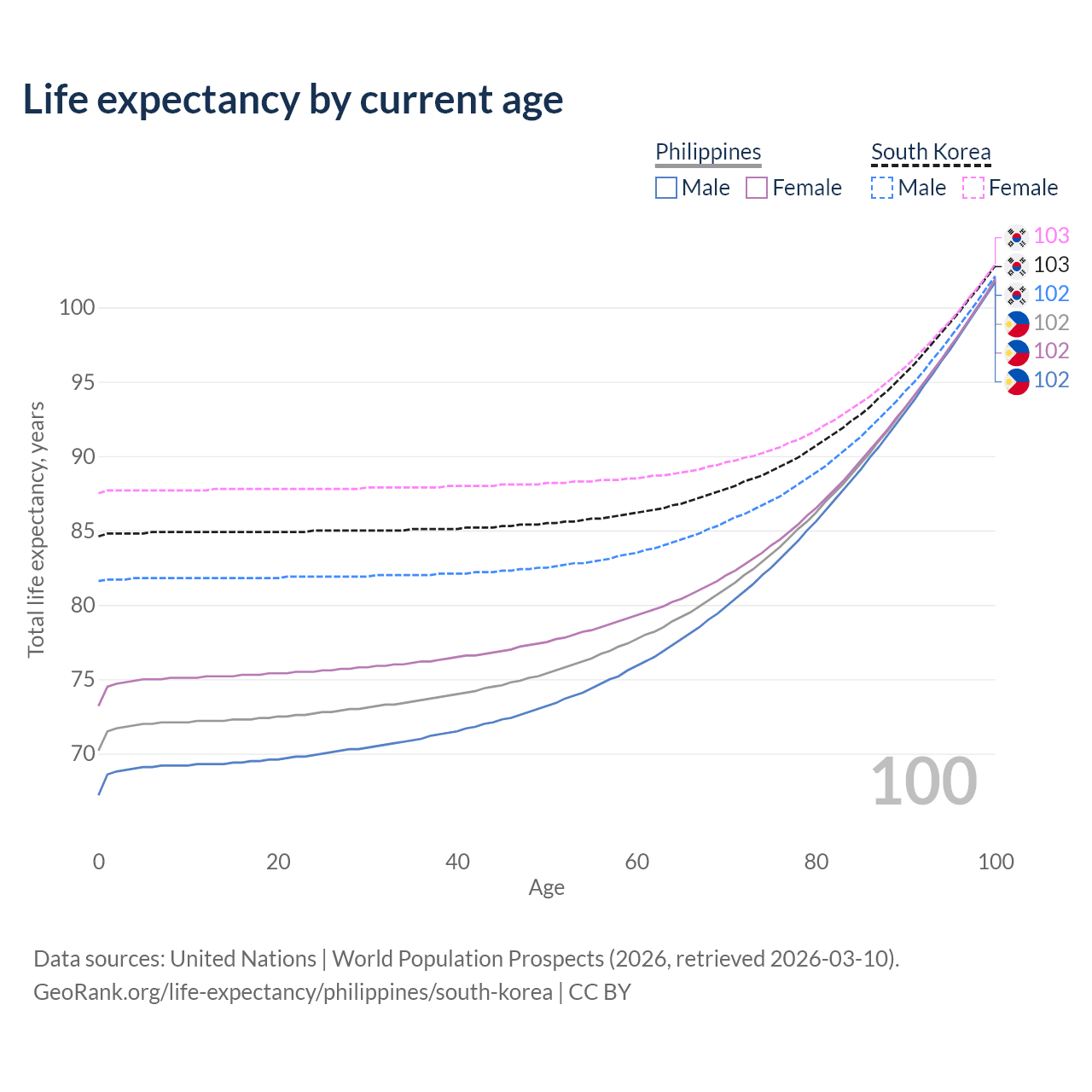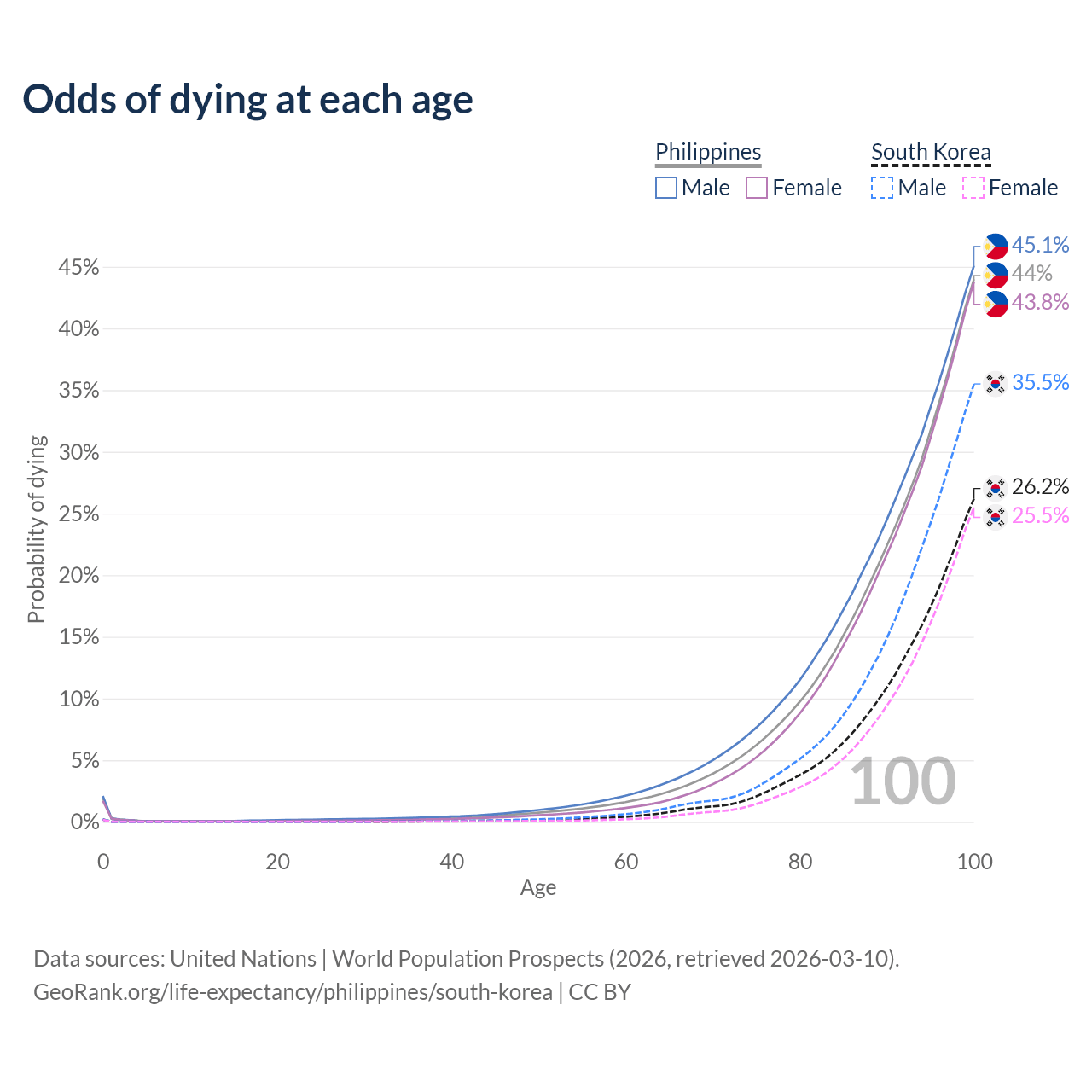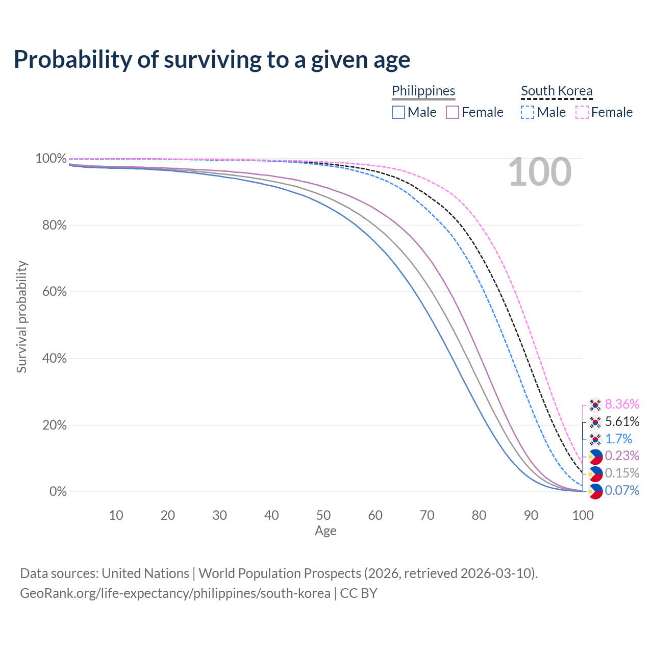 This life expectancy calculator shows the odds of living to 100, 95, 90, and below based on current age for both males and females in the Philippines and South Korea, along with mean and median age of death. The calculations are based on the 2026 life tables (actuarial tables) from the UN World Population Prospects.