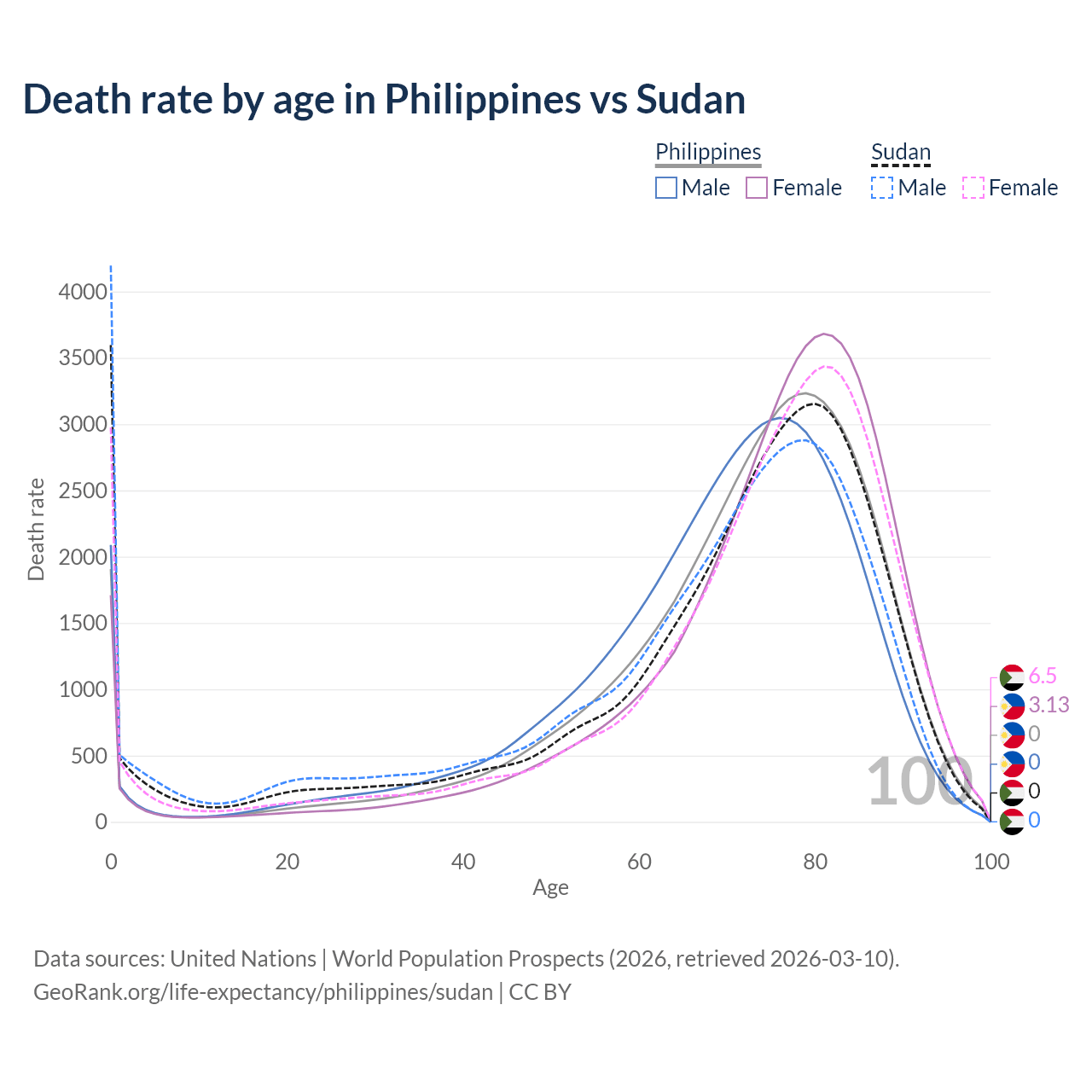 In the Philippines, the most common age of death is 79, compared to 0 in Sudan. The median age of death is 74.6 in the Philippines and 74.1 in Sudan, meaning only half of each cohort is expected to live past that age.