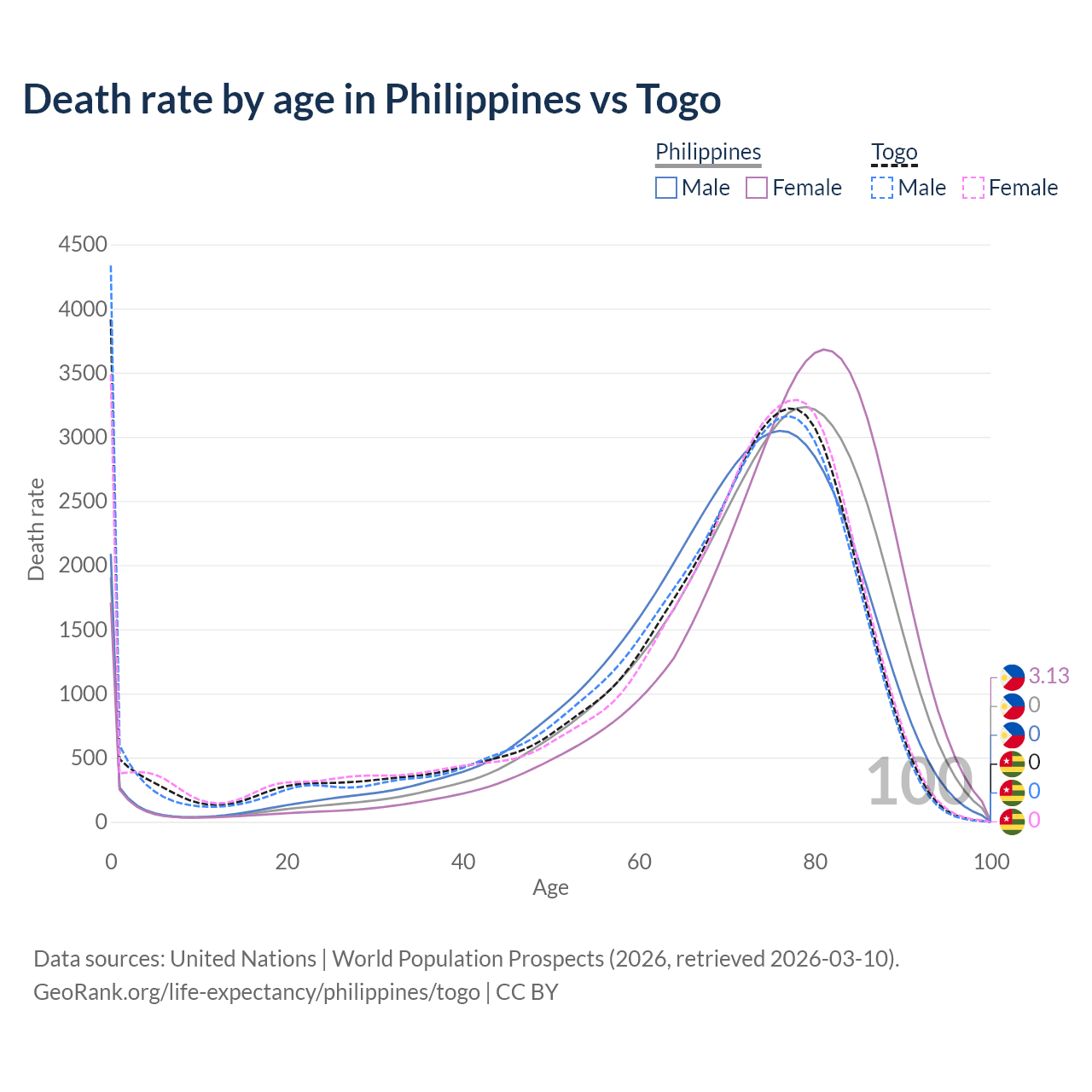 In the Philippines, the most common age of death is 79, compared to 0 in Togo. The median age of death is 74.6 in the Philippines and 71 in Togo, meaning only half of each cohort is expected to live past that age.