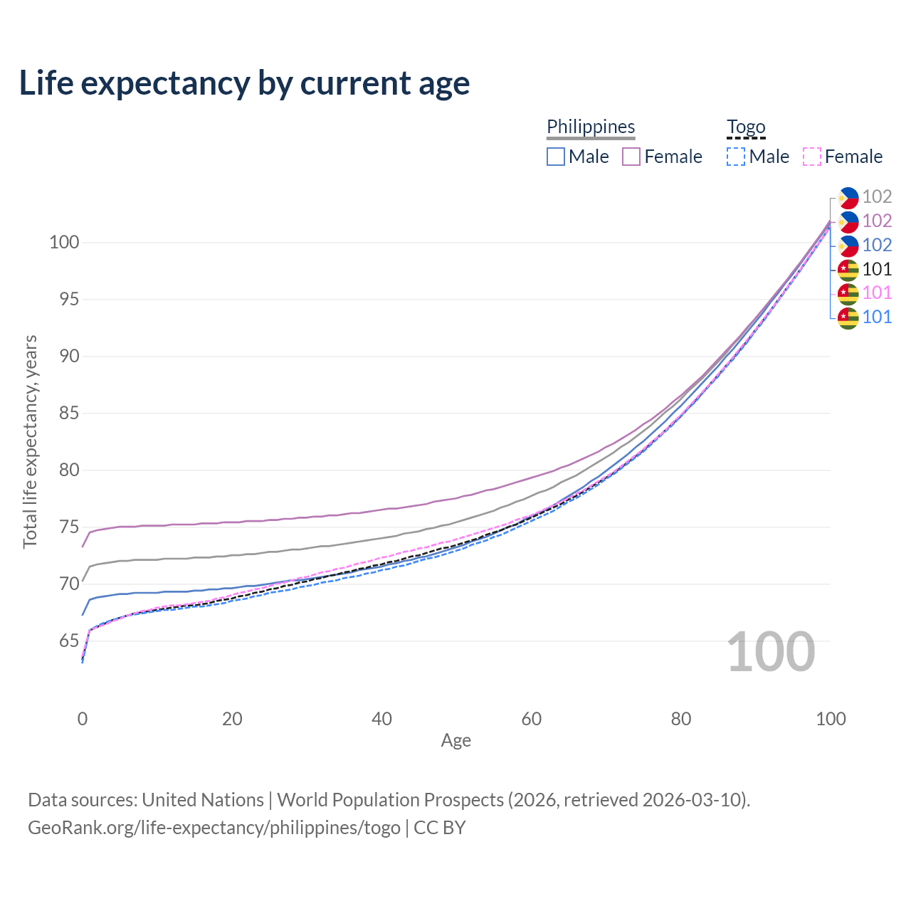 This life expectancy calculator shows the odds of living to 100, 95, 90, and below based on current age for both males and females in the Philippines and Togo, along with mean and median age of death. The calculations are based on the 2026 life tables (actuarial tables) from the UN World Population Prospects.