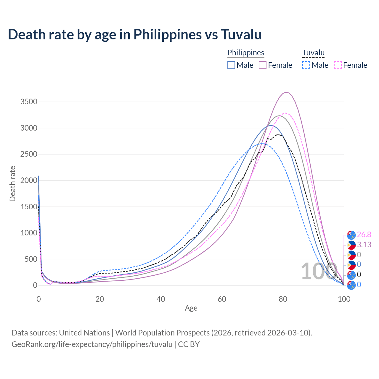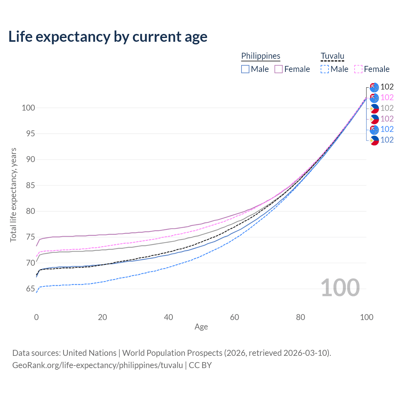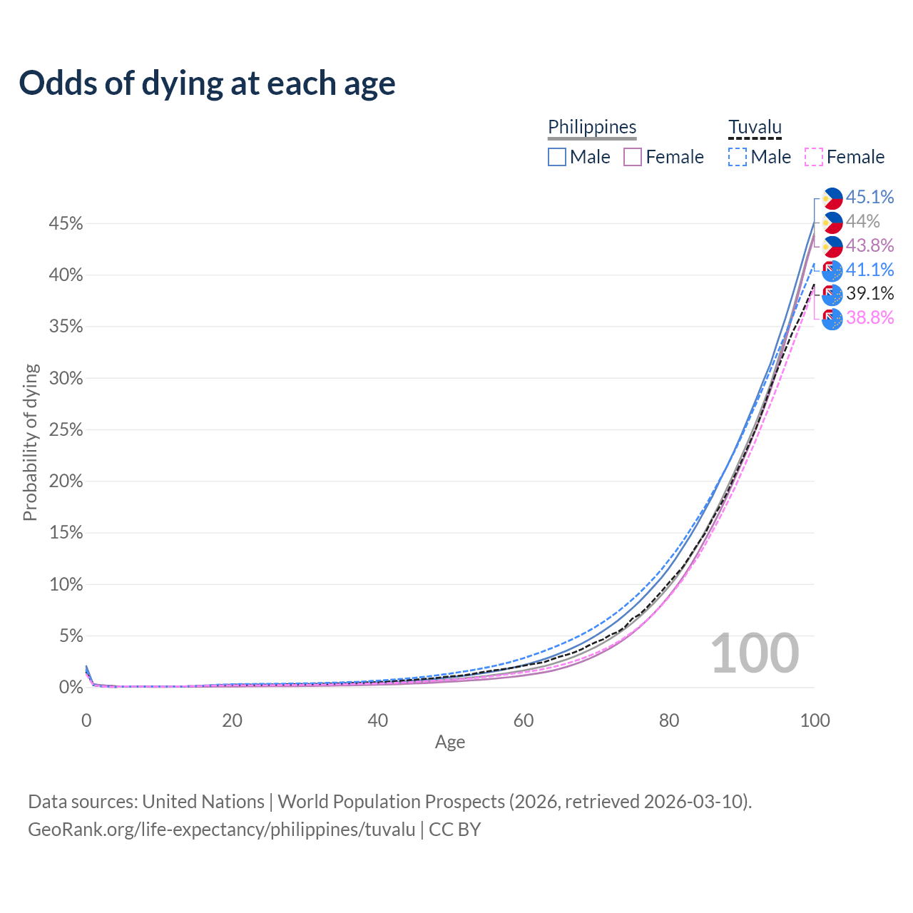 This life expectancy calculator shows the odds of living to 100, 95, 90, and below based on current age for both males and females in the Philippines and Tuvalu, along with mean and median age of death. The calculations are based on the 2026 life tables (actuarial tables) from the UN World Population Prospects.