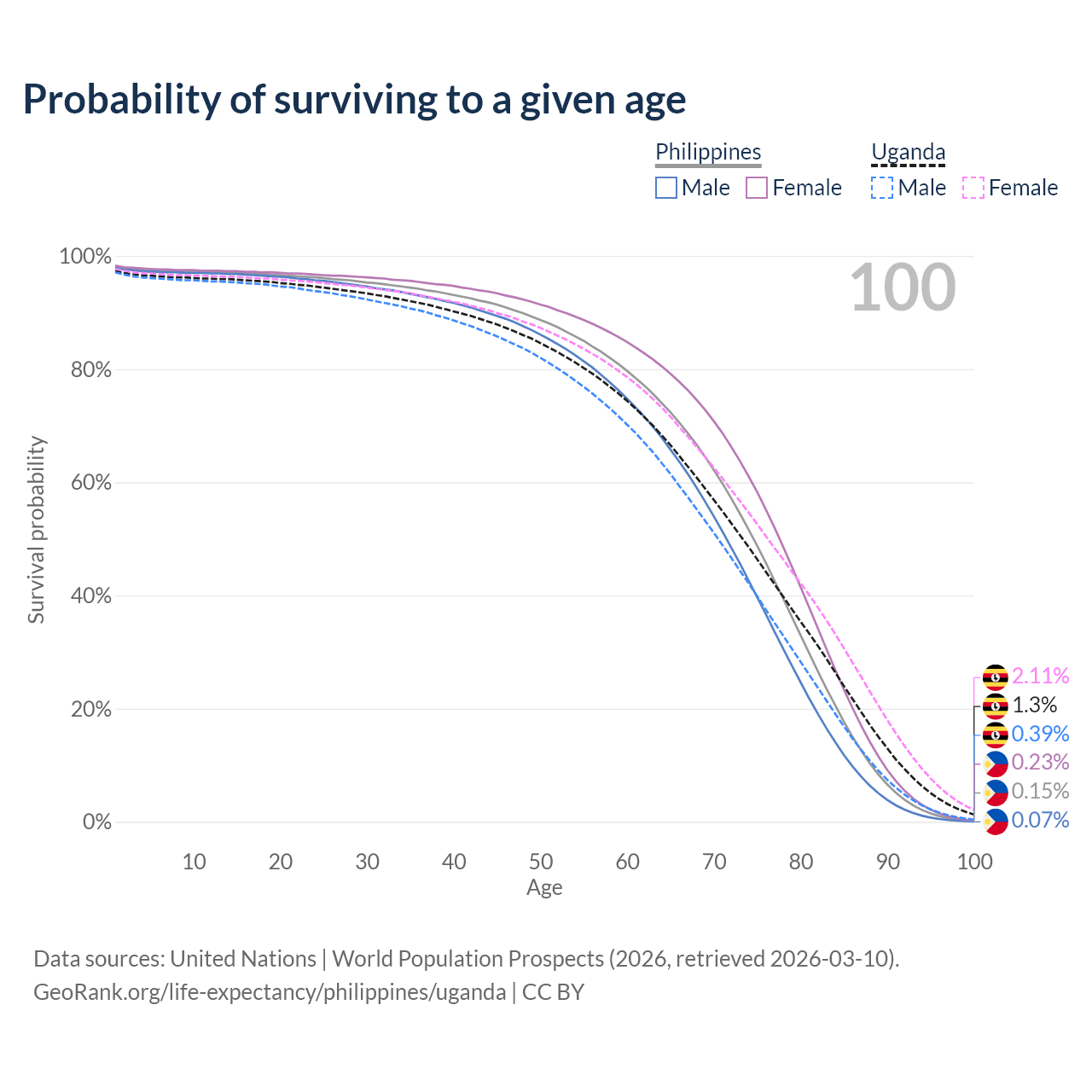 This life expectancy calculator shows the odds of living to 100, 95, 90, and below based on current age for both males and females in the Philippines and Uganda, along with mean and median age of death. The calculations are based on the 2026 life tables (actuarial tables) from the UN World Population Prospects.