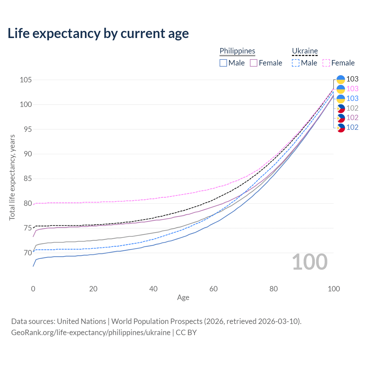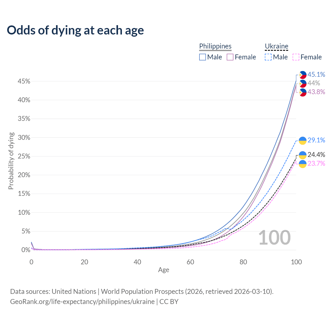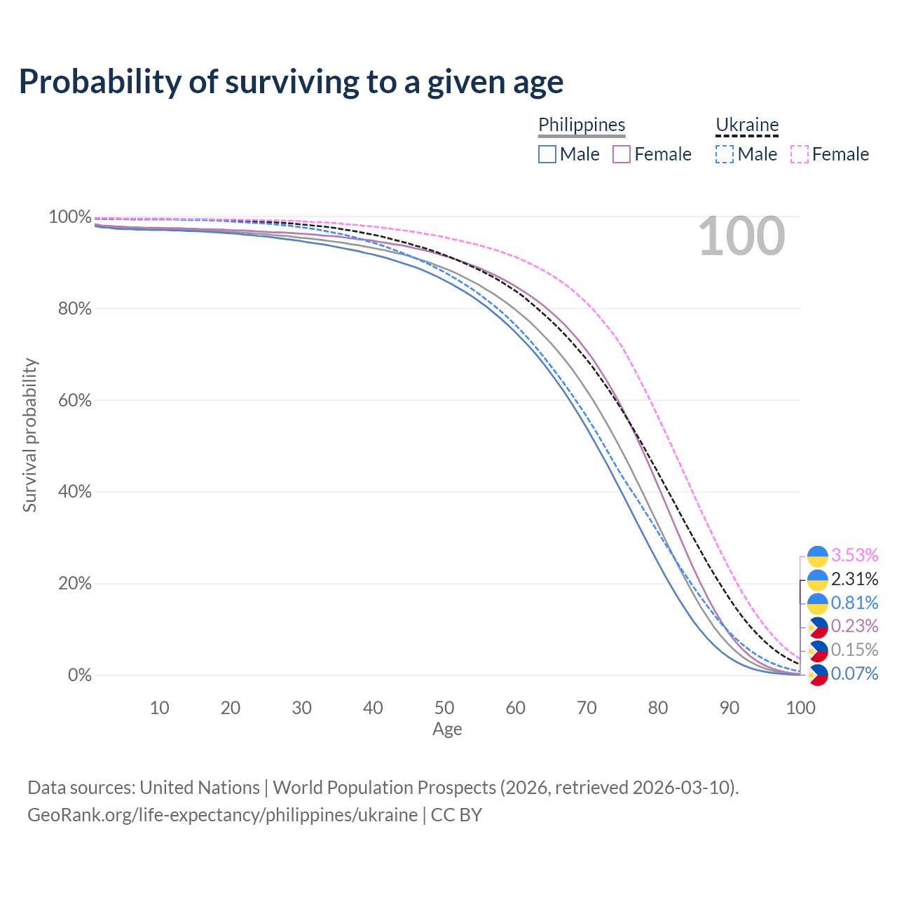 This life expectancy calculator shows the odds of living to 100, 95, 90, and below based on current age for both males and females in the Philippines and Ukraine, along with mean and median age of death. The calculations are based on the 2026 life tables (actuarial tables) from the UN World Population Prospects.