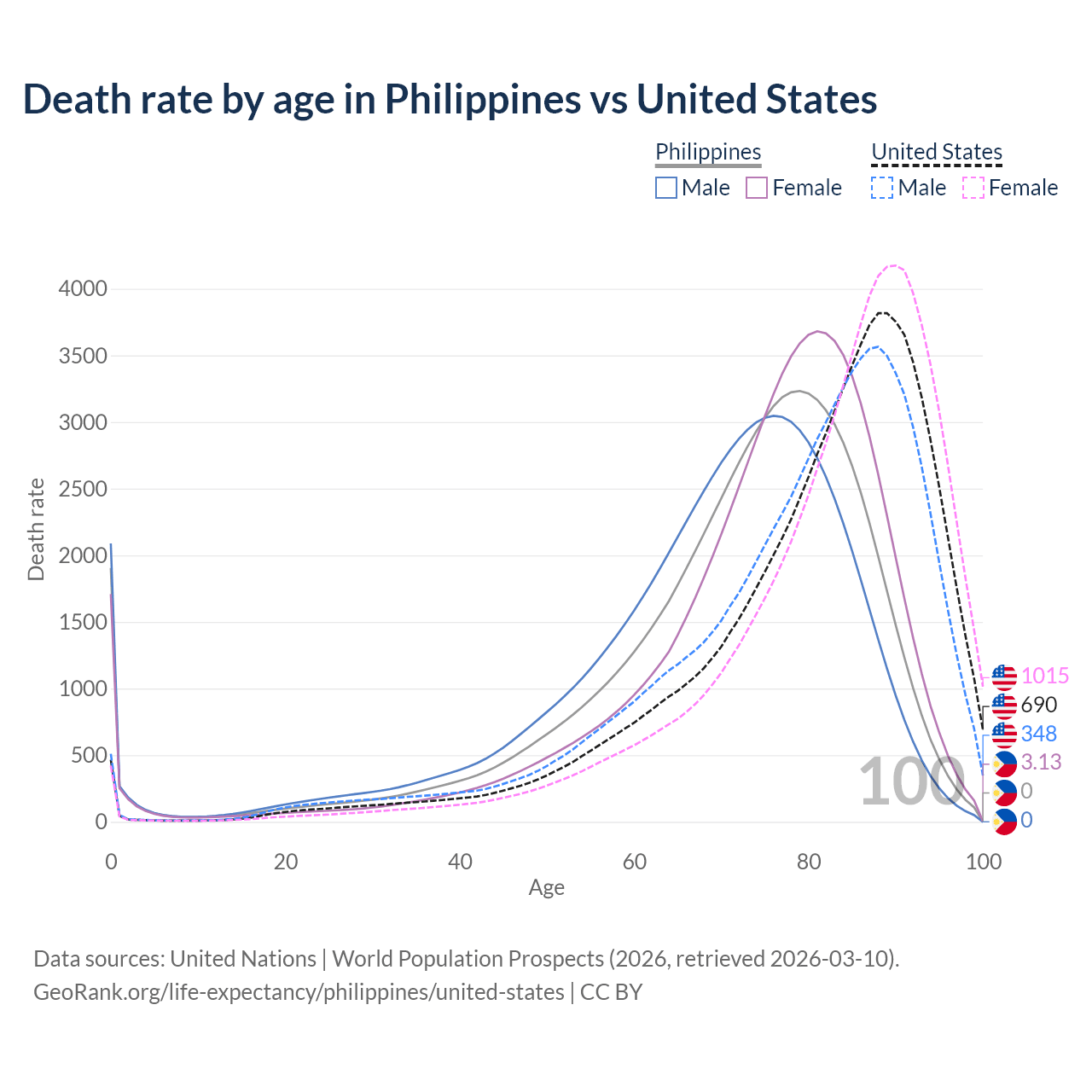 This life expectancy calculator shows the odds of living to 100, 95, 90, and below based on current age for both males and females in the Philippines and the United States, along with mean and median age of death. The calculations are based on the 2026 life tables (actuarial tables) from the UN World Population Prospects.