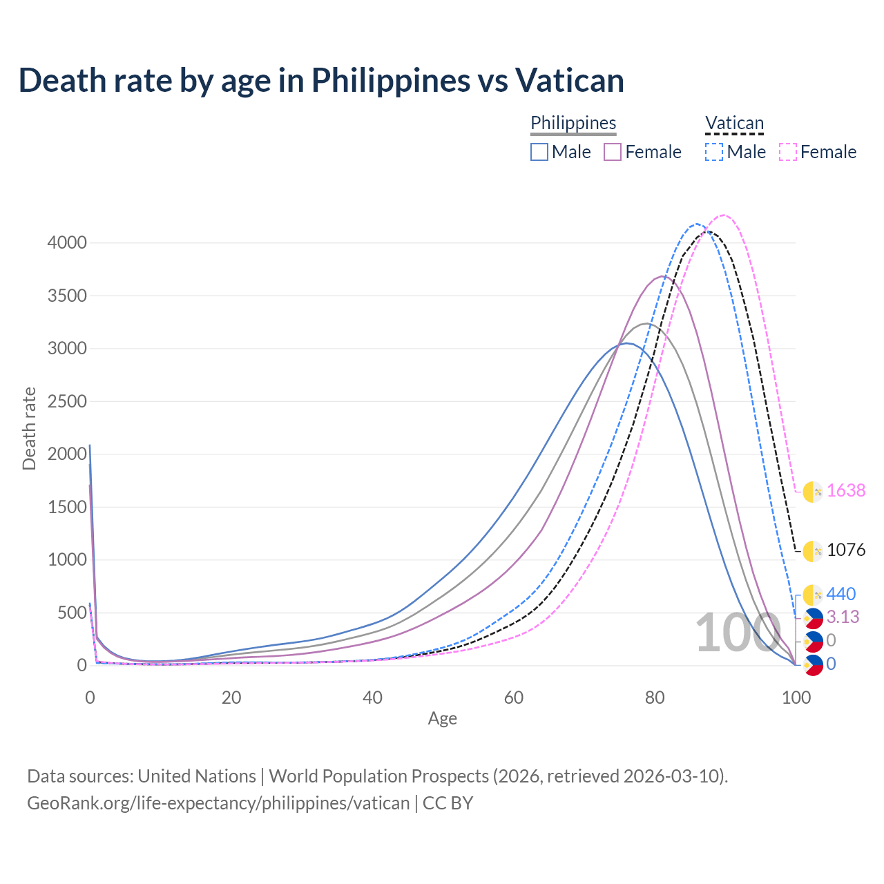 In the Philippines, the most common age of death is 79, compared to 88 in the Vatican. The median age of death is 74.6 in the Philippines and 85.7 in the Vatican, meaning only half of each cohort is expected to live past that age.
