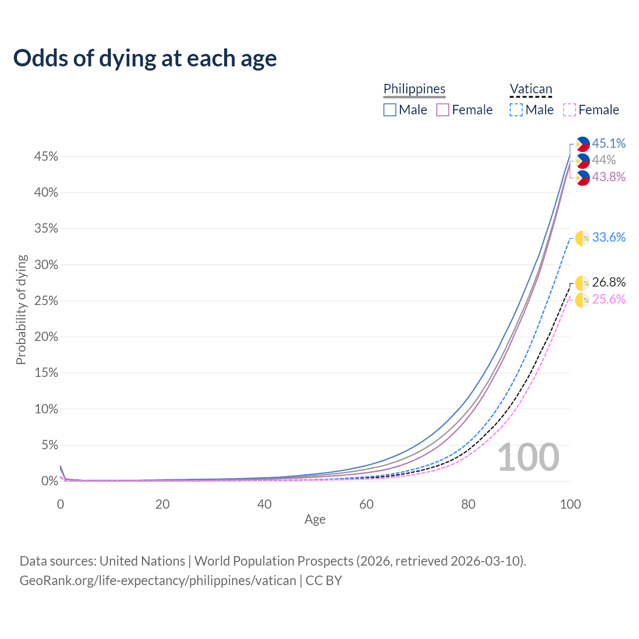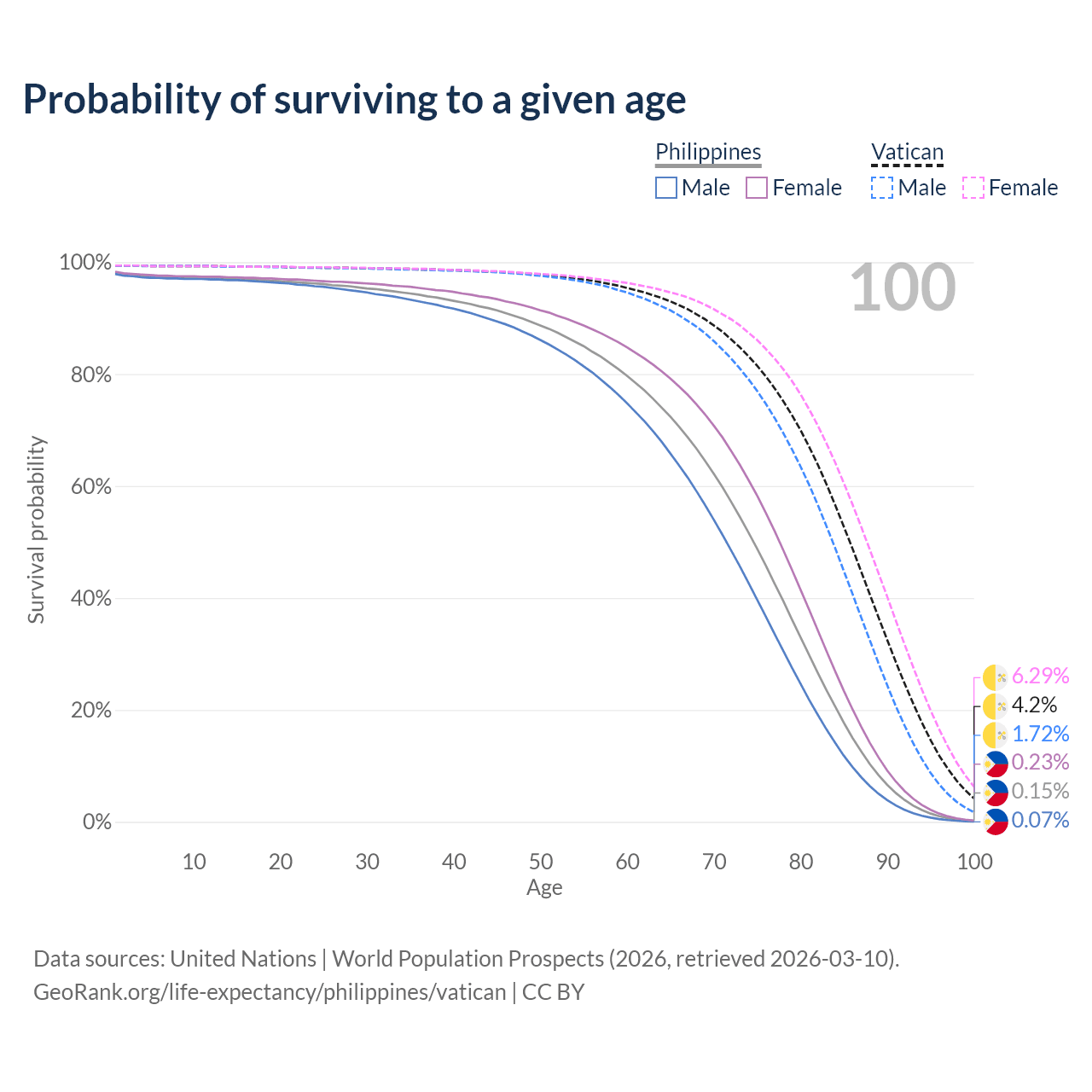 This life expectancy calculator shows the odds of living to 100, 95, 90, and below based on current age for both males and females in the Philippines and the Vatican, along with mean and median age of death. The calculations are based on the 2026 life tables (actuarial tables) from the UN World Population Prospects.