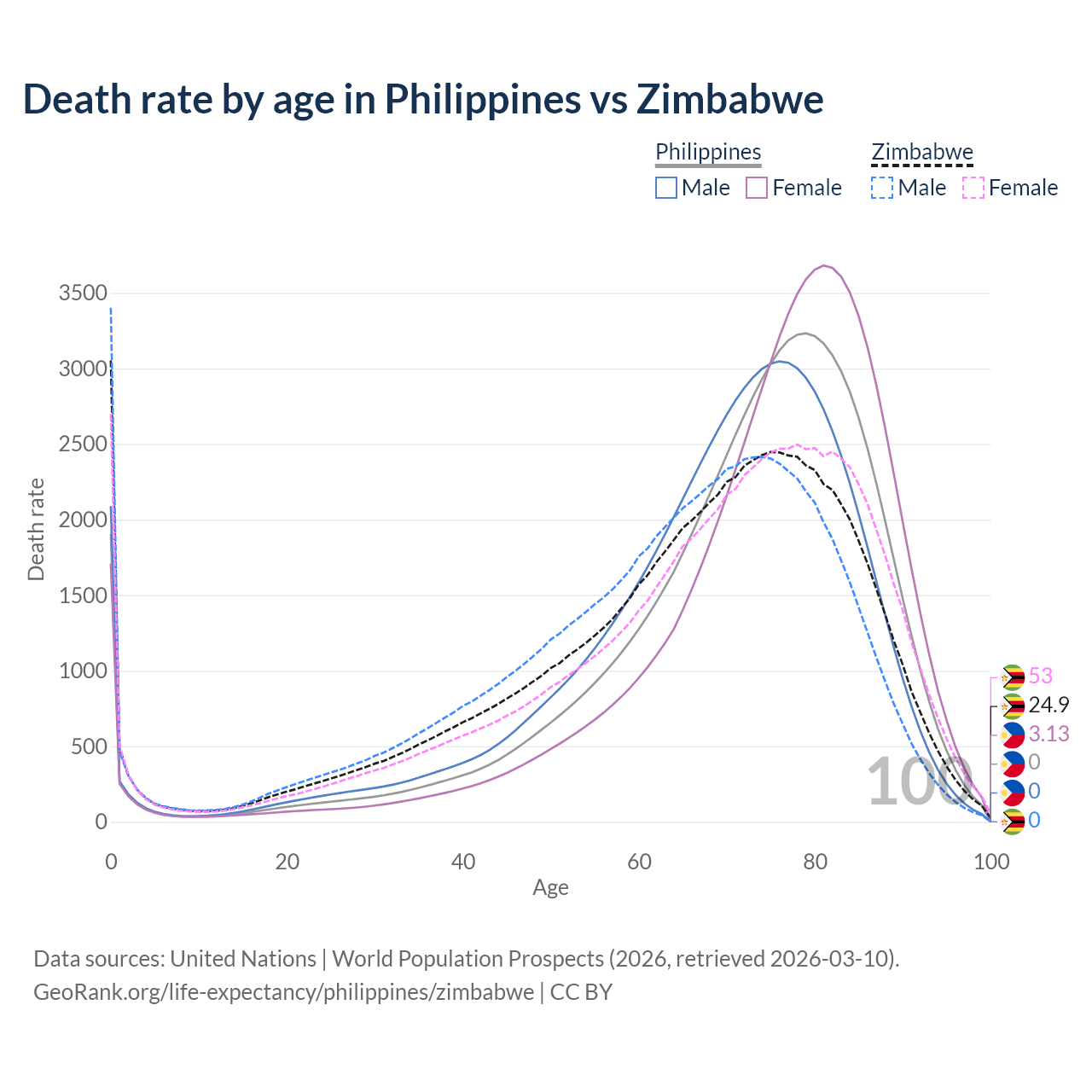 In the Philippines, the most common age of death is 79, compared to 0 in Zimbabwe. The median age of death is 74.6 in the Philippines and 68.8 in Zimbabwe, meaning only half of each cohort is expected to live past that age.