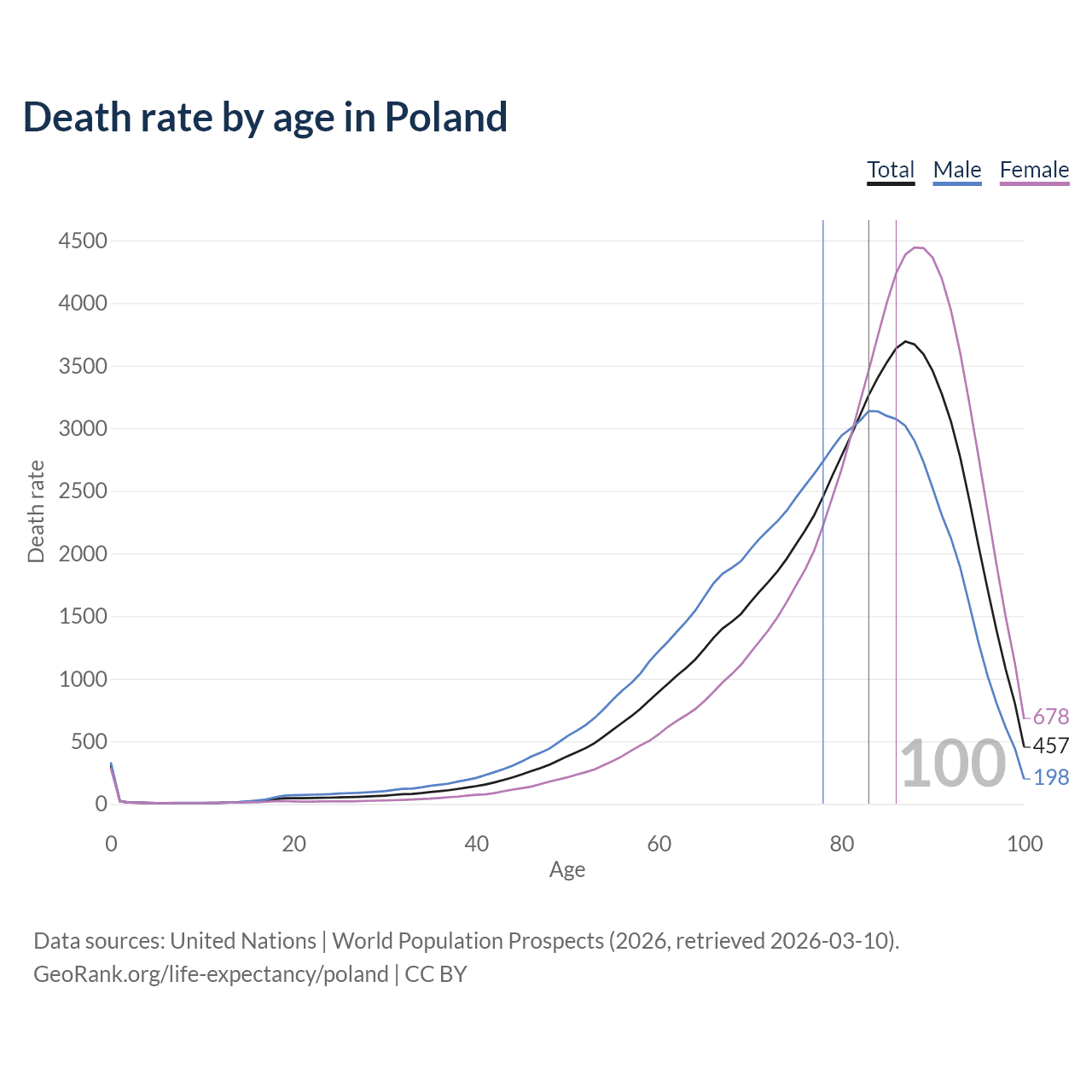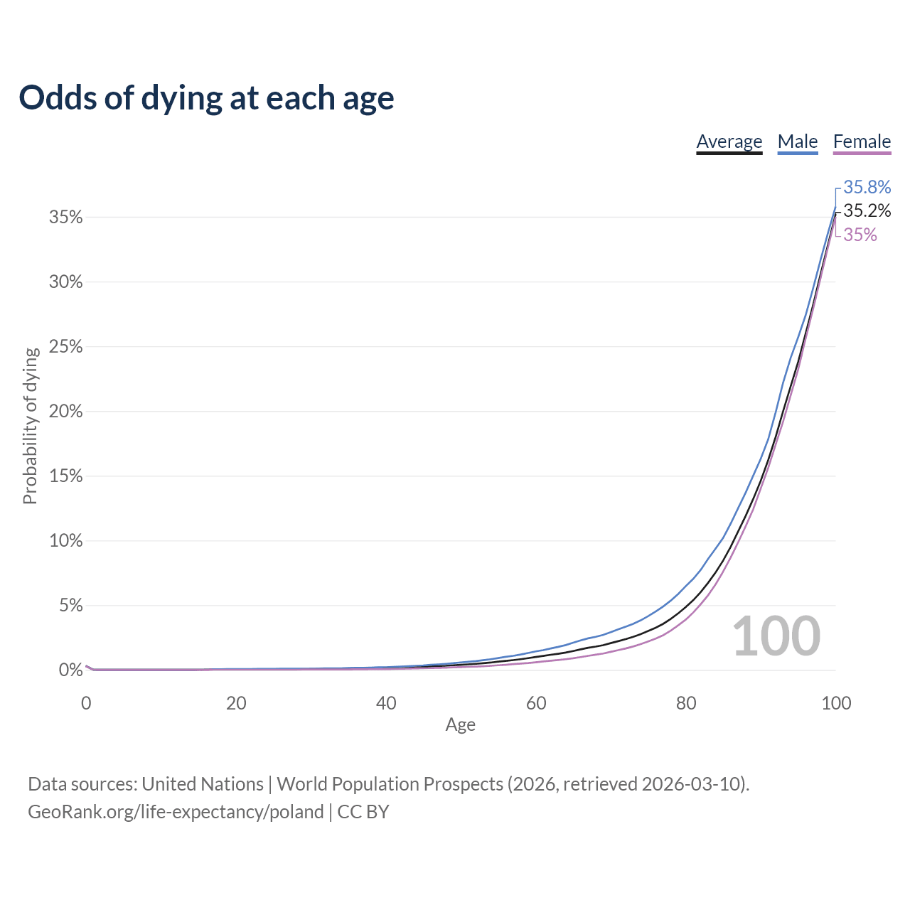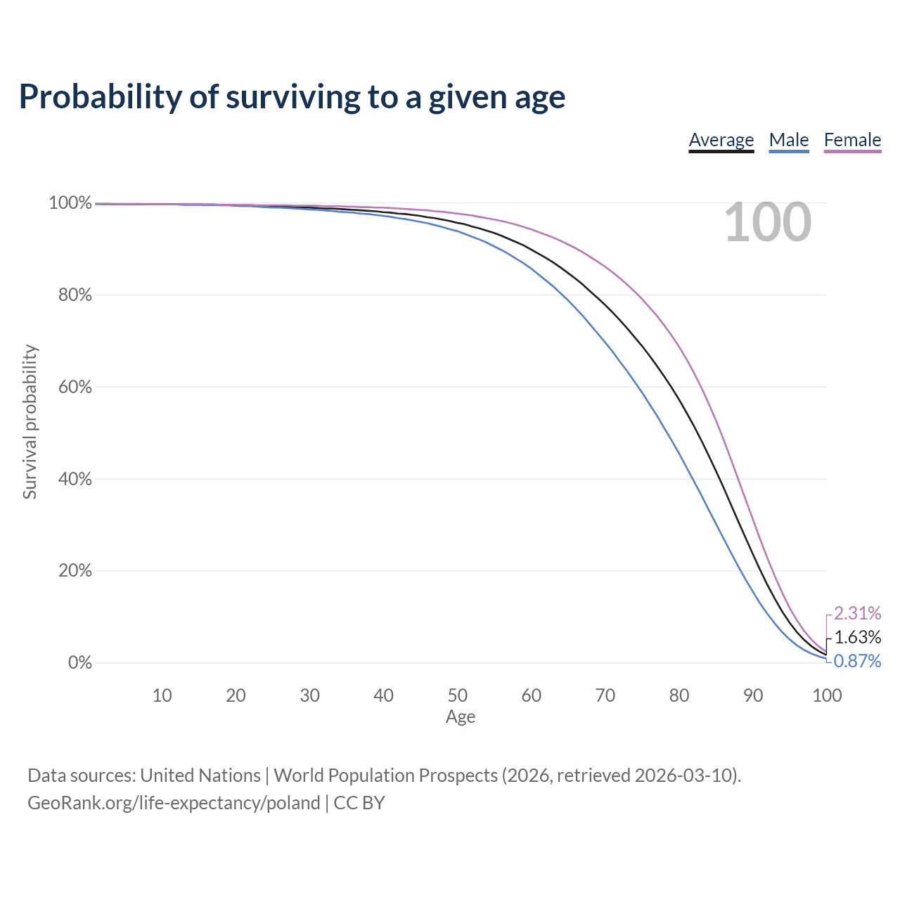 This life expectancy calculator shows the odds of living to 100, 95, 90, and below based on current age for both males and females in Poland, along with mean and median age of death. The calculations are based on the 2026 life tables (actuarial tables) from the UN World Population Prospects.