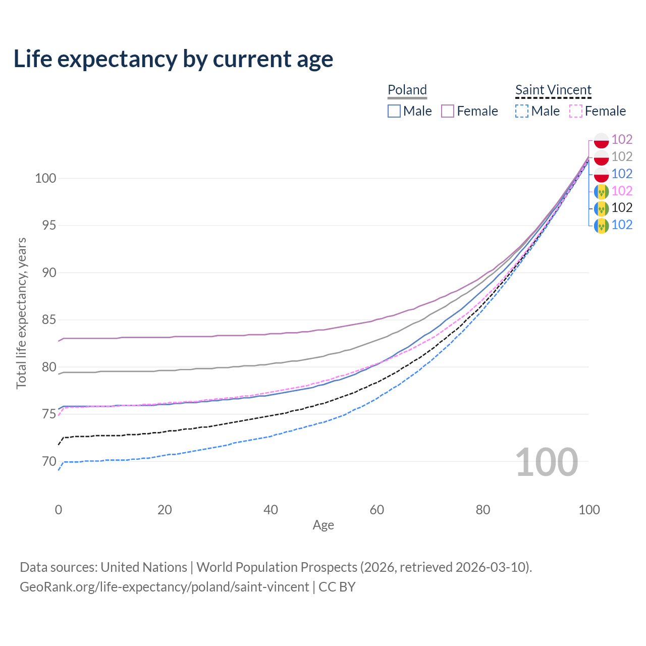 This life expectancy calculator shows the odds of living to 100, 95, 90, and below based on current age for both males and females in Poland and Saint Vincent, along with mean and median age of death. The calculations are based on the 2026 life tables (actuarial tables) from the UN World Population Prospects.