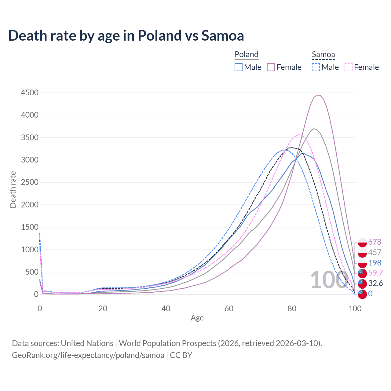 In Poland, the most common age of death is 87, compared to 80 in Samoa. The median age of death is 82.5 in Poland and 75.9 in Samoa, meaning only half of each cohort is expected to live past that age.