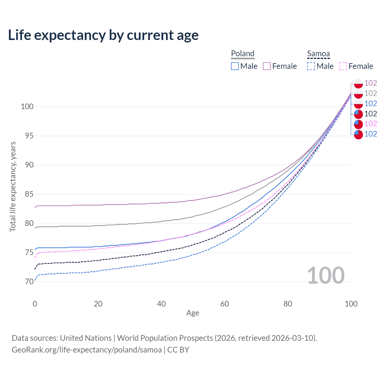 This life expectancy calculator shows the odds of living to 100, 95, 90, and below based on current age for both males and females in Poland and Samoa, along with mean and median age of death. The calculations are based on the 2026 life tables (actuarial tables) from the UN World Population Prospects.