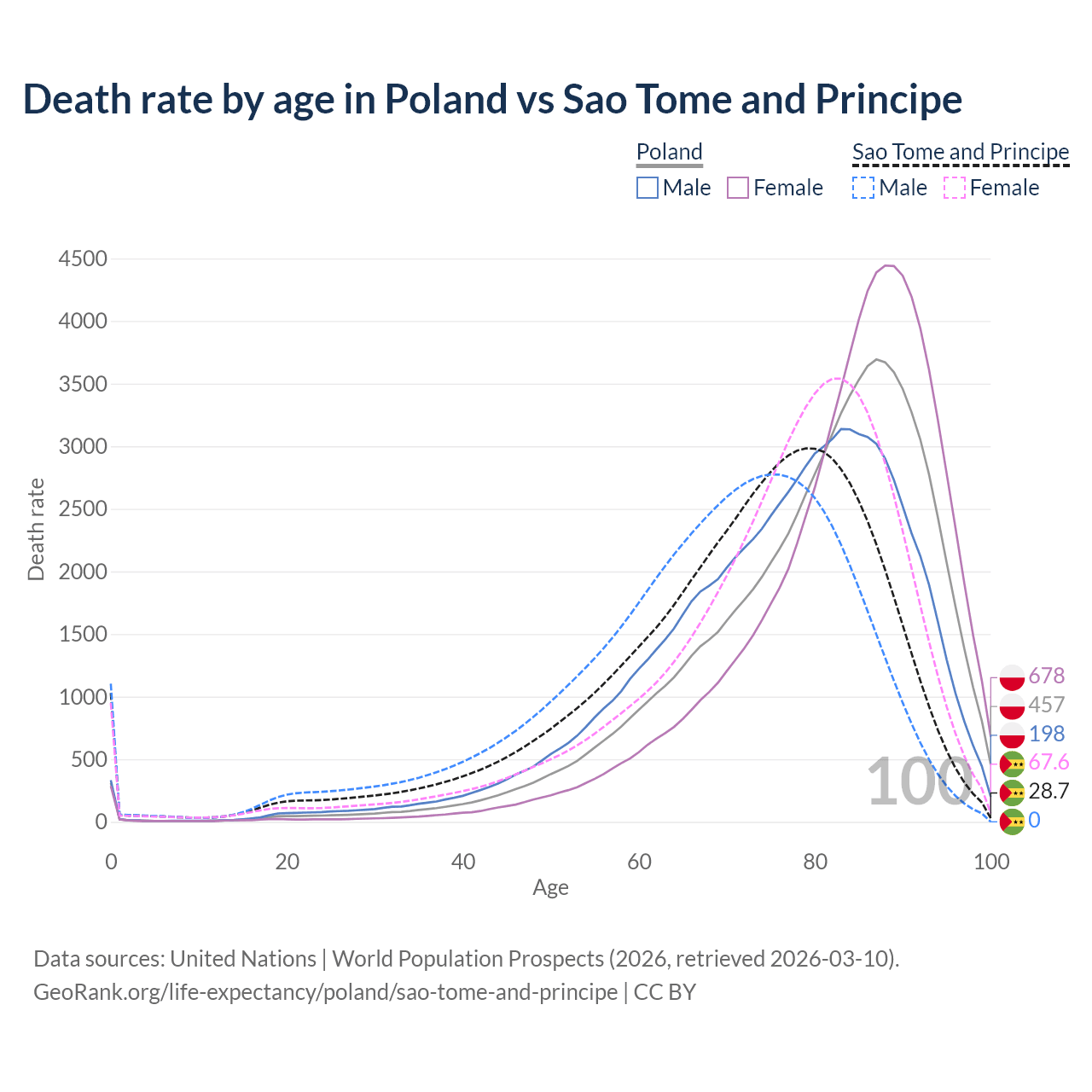 In Poland, the most common age of death is 87, compared to 79 in Sao Tome and Principe. The median age of death is 82.5 in Poland and 74.1 in Sao Tome and Principe, meaning only half of each cohort is expected to live past that age.