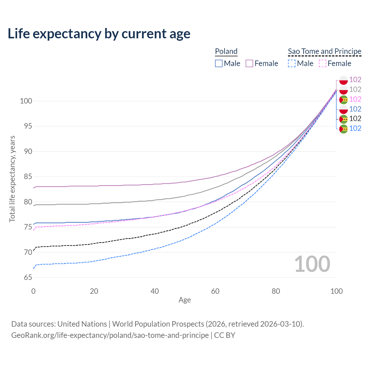 This life expectancy calculator shows the odds of living to 100, 95, 90, and below based on current age for both males and females in Poland and Sao Tome and Principe, along with mean and median age of death. The calculations are based on the 2026 life tables (actuarial tables) from the UN World Population Prospects.