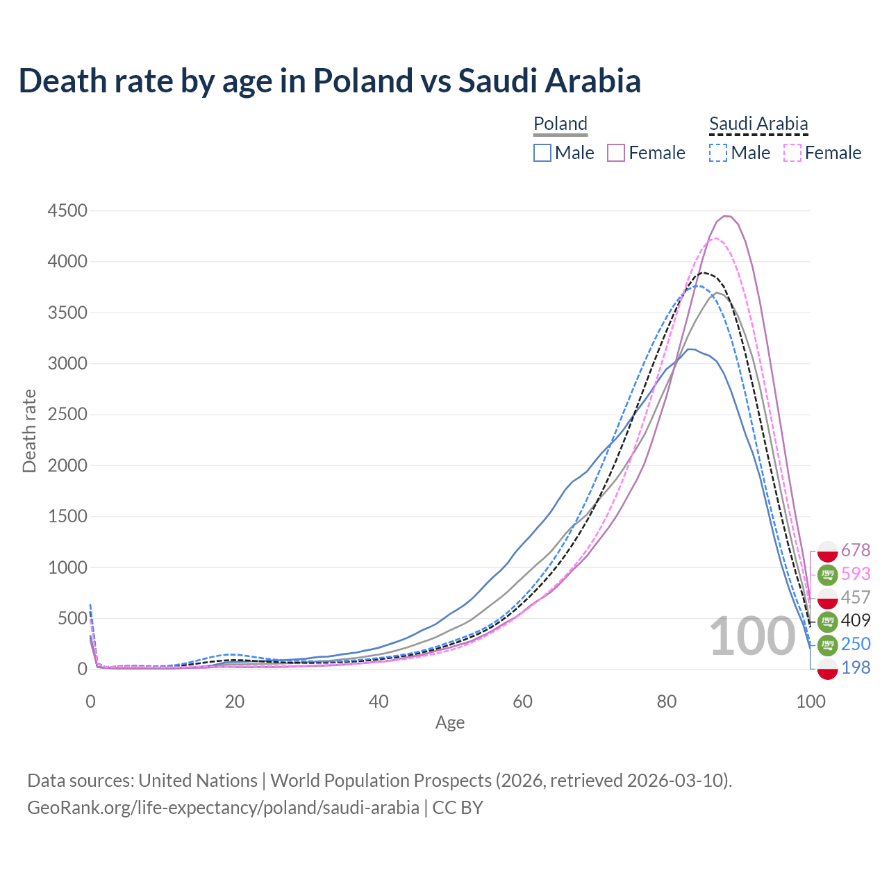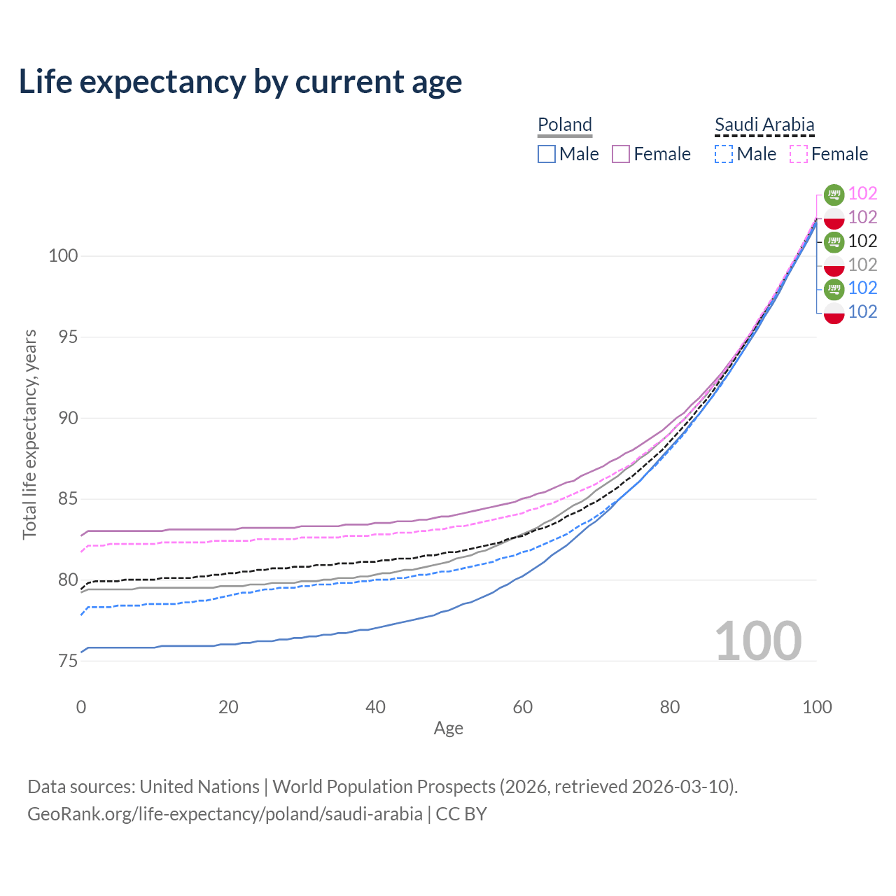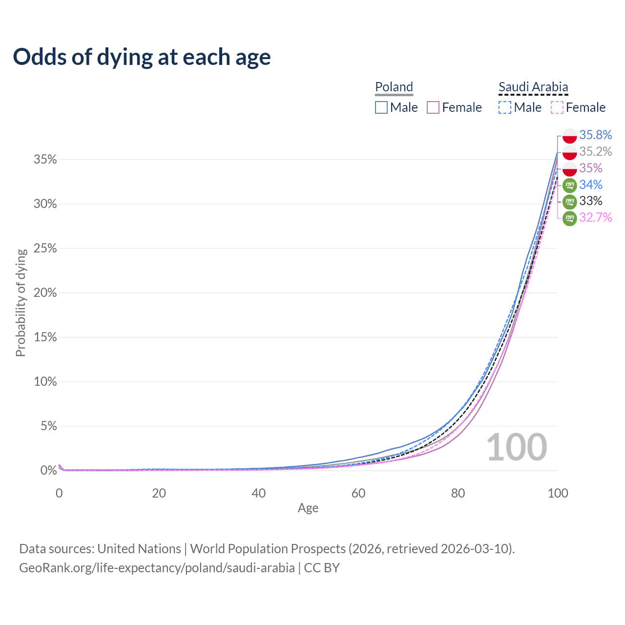 This life expectancy calculator shows the odds of living to 100, 95, 90, and below based on current age for both males and females in Poland and Saudi Arabia, along with mean and median age of death. The calculations are based on the 2026 life tables (actuarial tables) from the UN World Population Prospects.