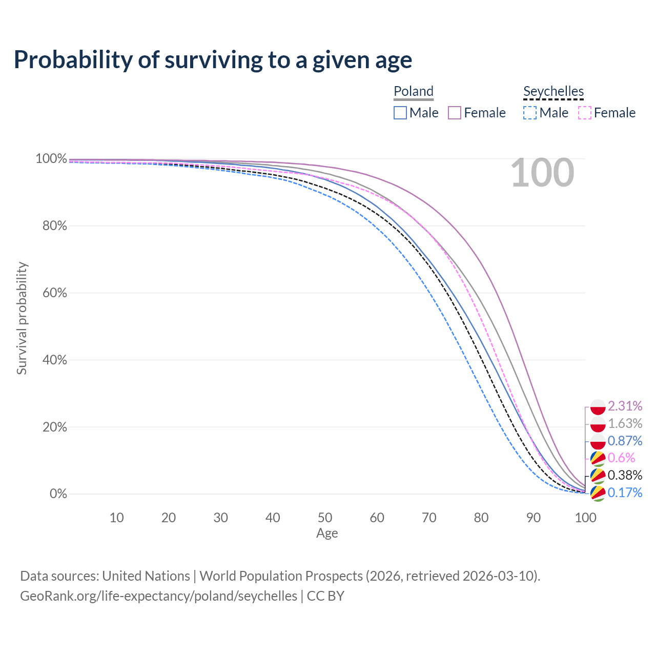 This life expectancy calculator shows the odds of living to 100, 95, 90, and below based on current age for both males and females in Poland and the Seychelles, along with mean and median age of death. The calculations are based on the 2026 life tables (actuarial tables) from the UN World Population Prospects.