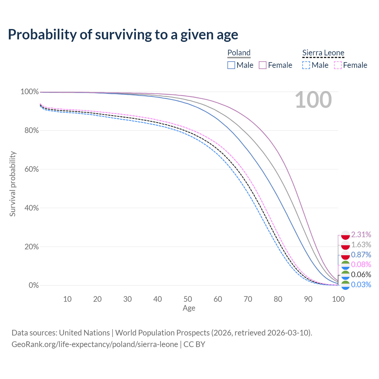 This life expectancy calculator shows the odds of living to 100, 95, 90, and below based on current age for both males and females in Poland and Sierra Leone, along with mean and median age of death. The calculations are based on the 2026 life tables (actuarial tables) from the UN World Population Prospects.
