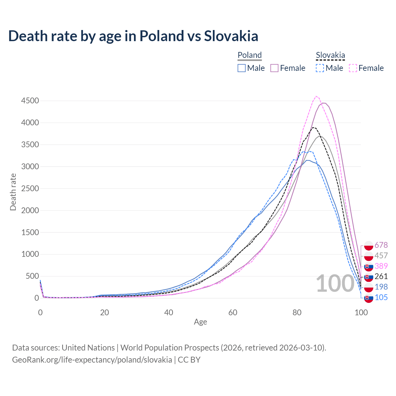 This life expectancy calculator shows the odds of living to 100, 95, 90, and below based on current age for both males and females in Poland and Slovakia, along with mean and median age of death. The calculations are based on the 2026 life tables (actuarial tables) from the UN World Population Prospects.