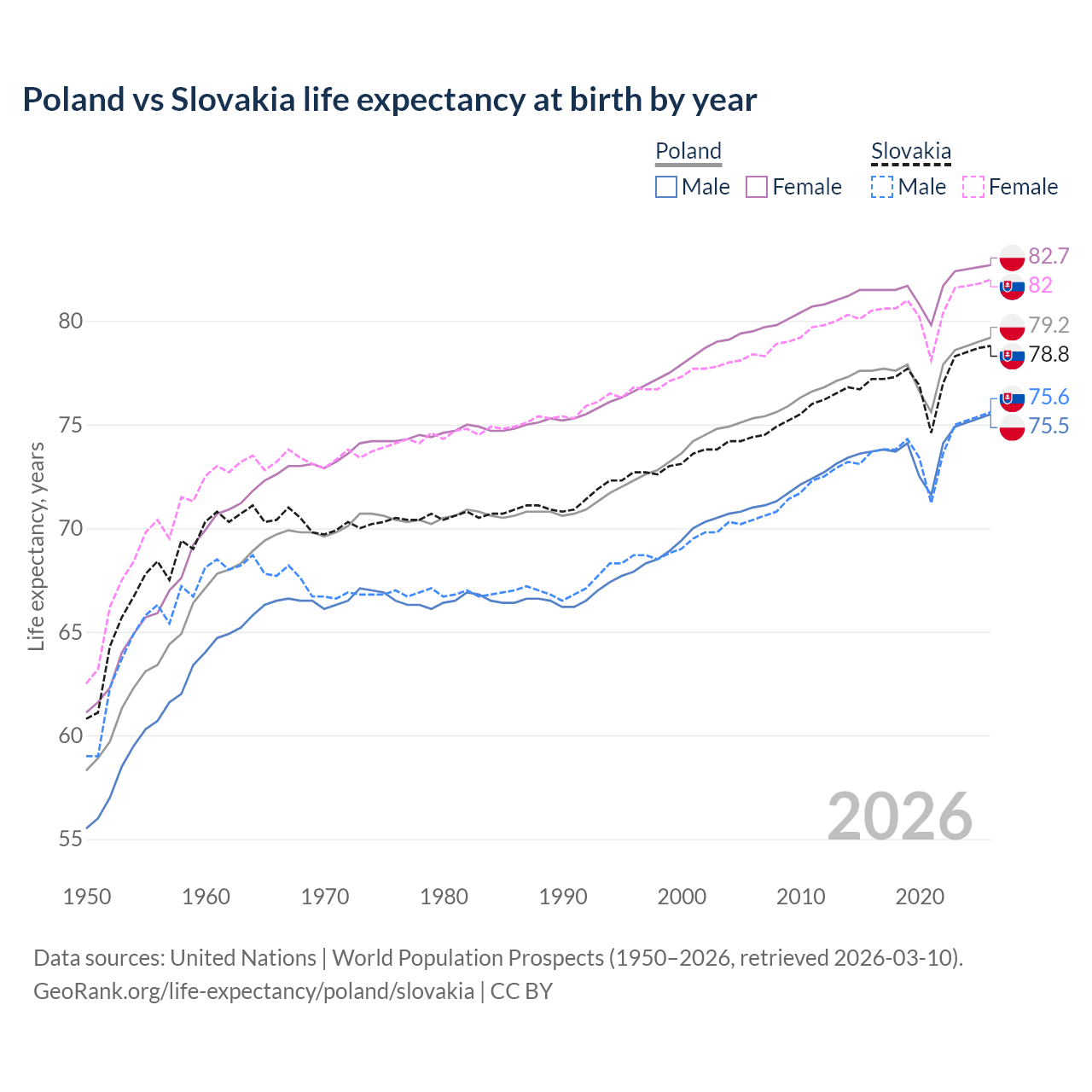 The average life expectancy at birth is 79.2 years in Poland vs 78.8 in Slovakia. Poland is ranked 50/197 by life expectancy, and Slovakia is 53/197. In Poland, the life expectancy is 75.5 years for males and 82.7 years for females. In Slovakia, it's 75.6 years for males and 82 years for females.