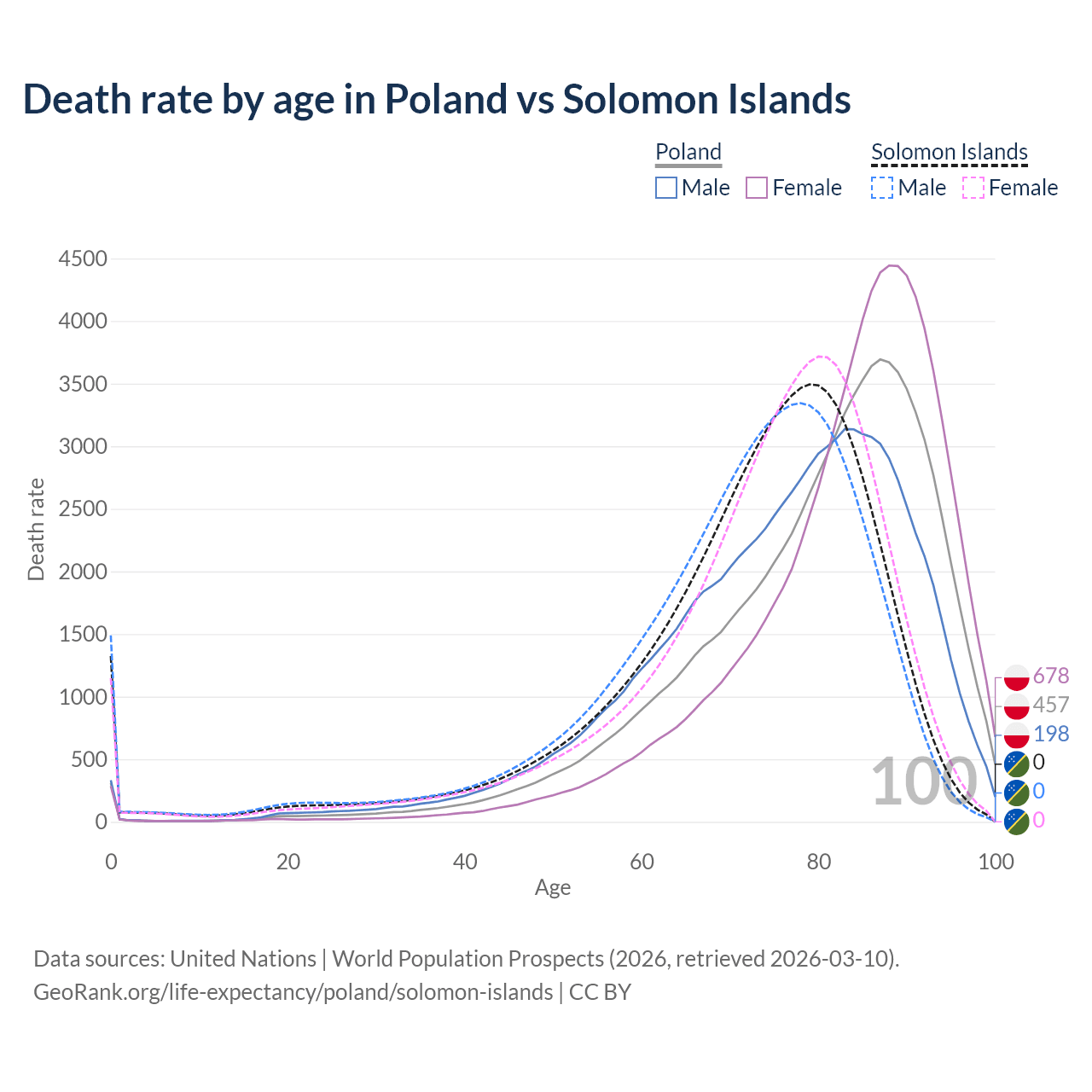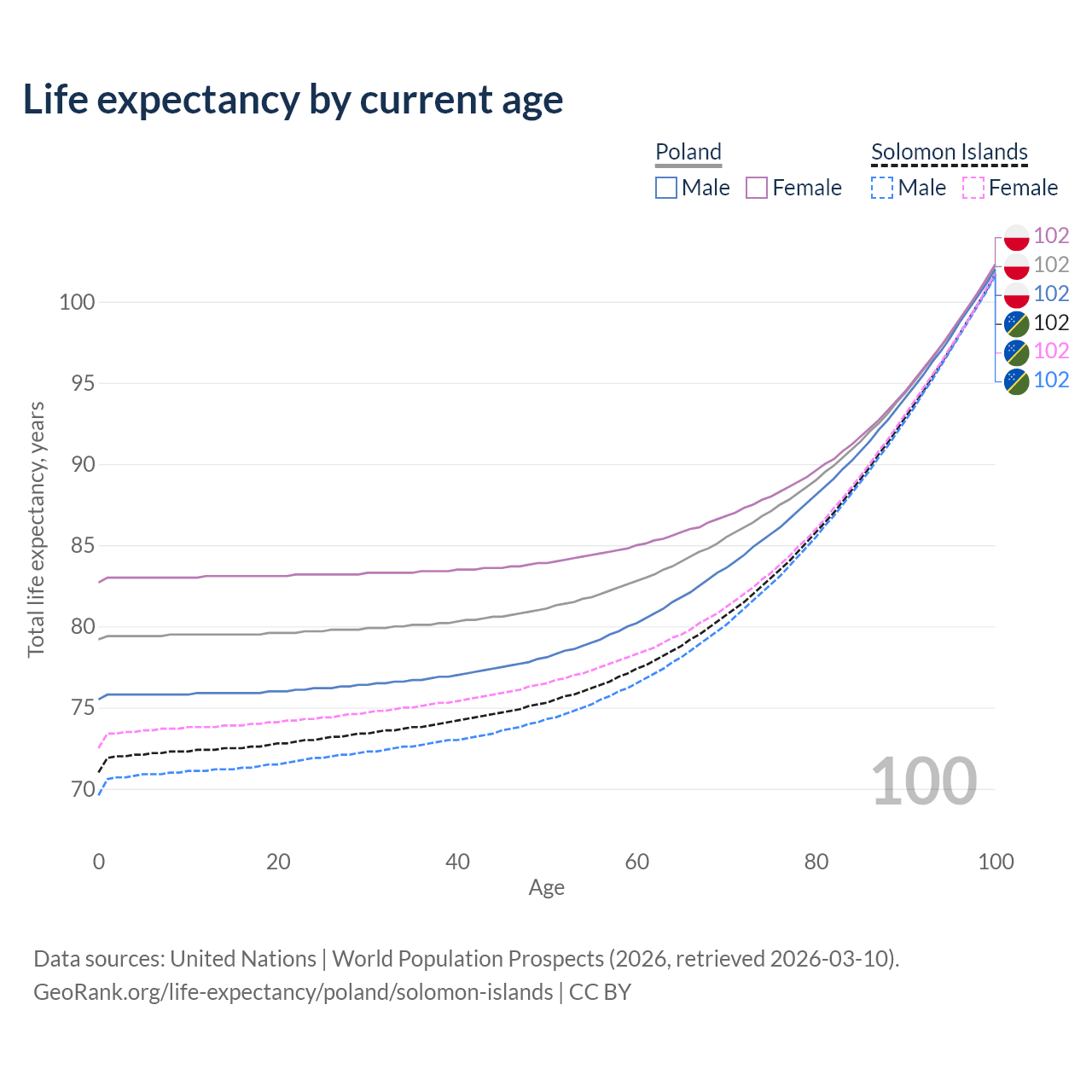 This life expectancy calculator shows the odds of living to 100, 95, 90, and below based on current age for both males and females in Poland and the Solomon Islands, along with mean and median age of death. The calculations are based on the 2026 life tables (actuarial tables) from the UN World Population Prospects.