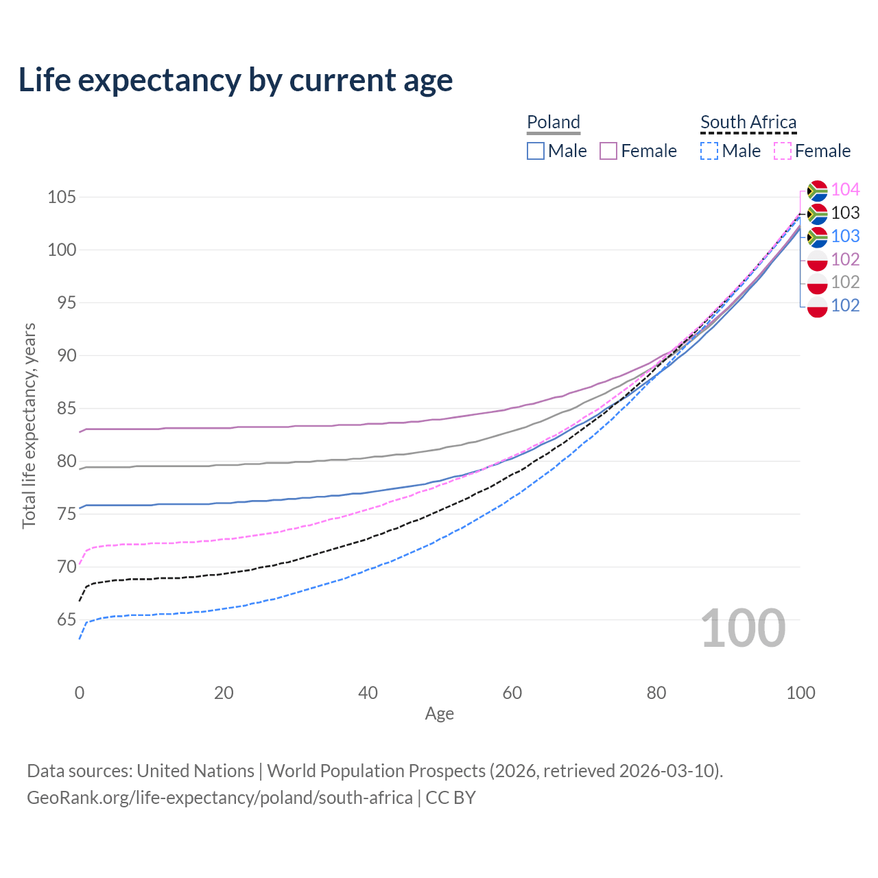 This life expectancy calculator shows the odds of living to 100, 95, 90, and below based on current age for both males and females in Poland and South Africa, along with mean and median age of death. The calculations are based on the 2026 life tables (actuarial tables) from the UN World Population Prospects.