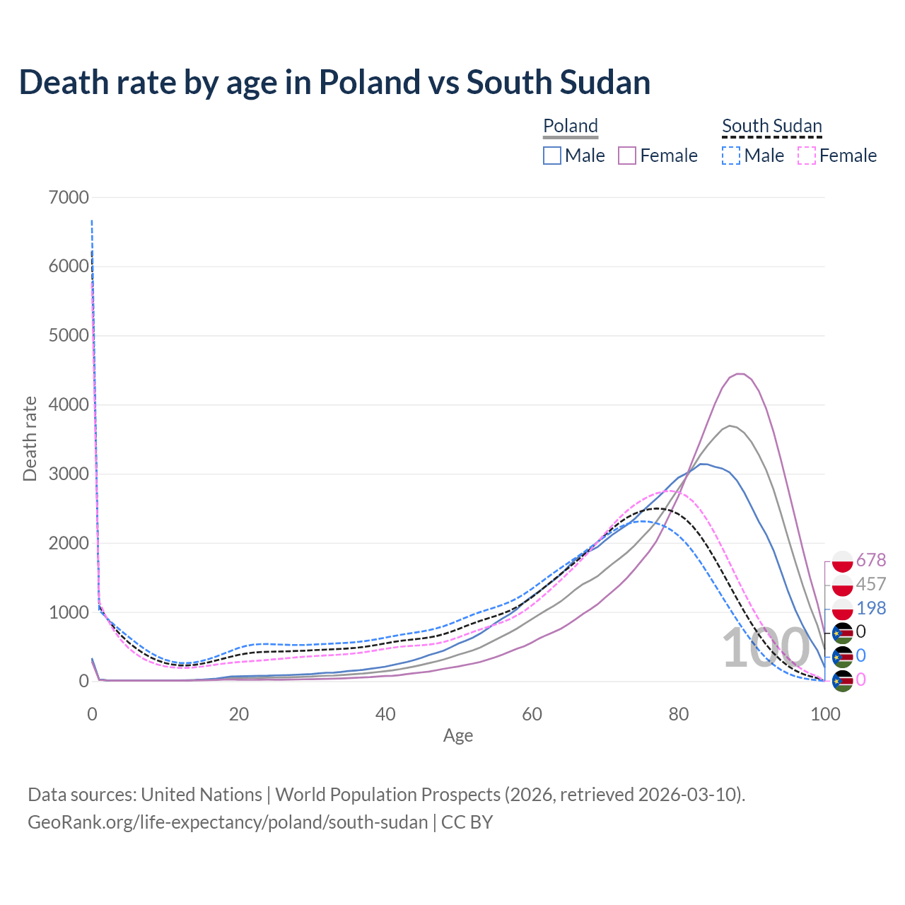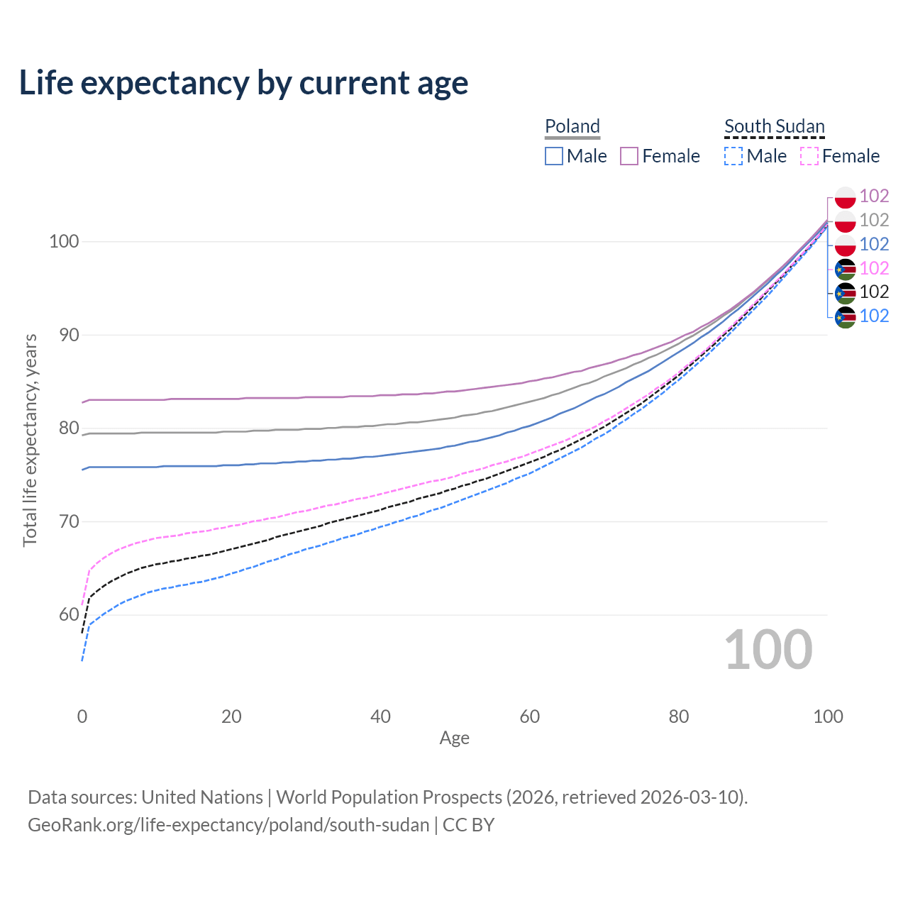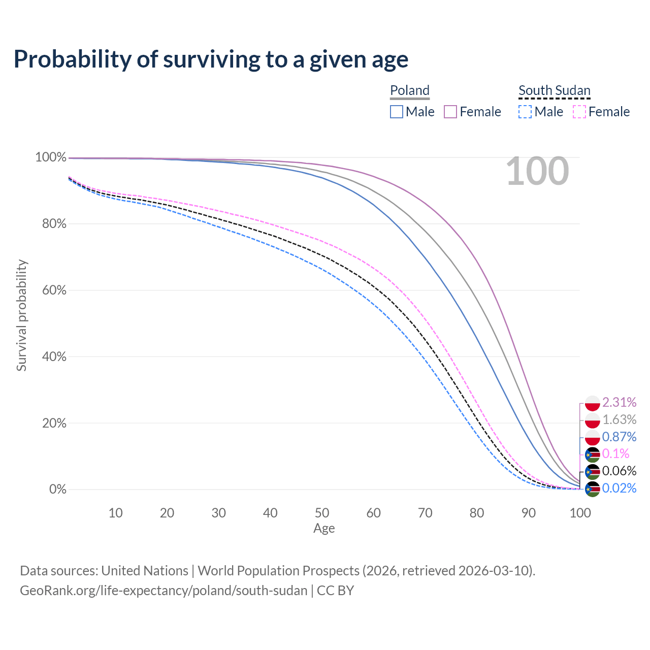 This life expectancy calculator shows the odds of living to 100, 95, 90, and below based on current age for both males and females in Poland and South Sudan, along with mean and median age of death. The calculations are based on the 2026 life tables (actuarial tables) from the UN World Population Prospects.