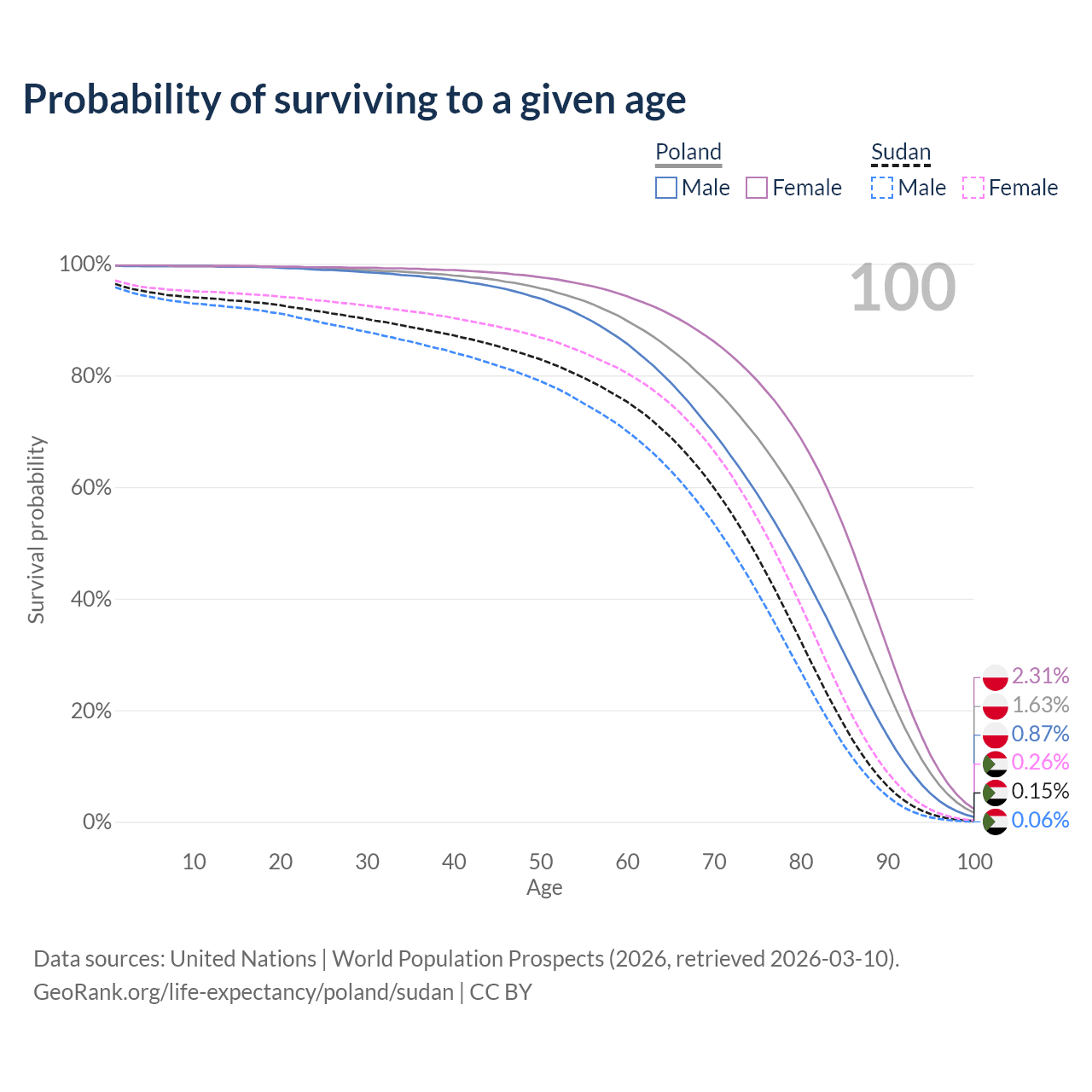 This life expectancy calculator shows the odds of living to 100, 95, 90, and below based on current age for both males and females in Poland and Sudan, along with mean and median age of death. The calculations are based on the 2026 life tables (actuarial tables) from the UN World Population Prospects.