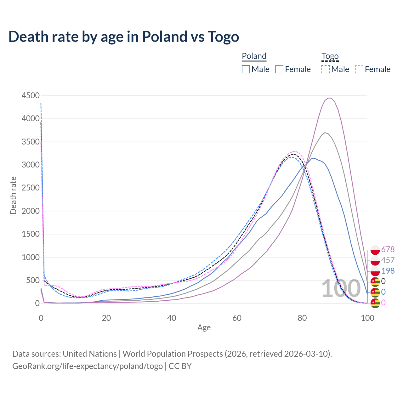 In Poland, the most common age of death is 87, compared to 0 in Togo. The median age of death is 82.5 in Poland and 71 in Togo, meaning only half of each cohort is expected to live past that age.