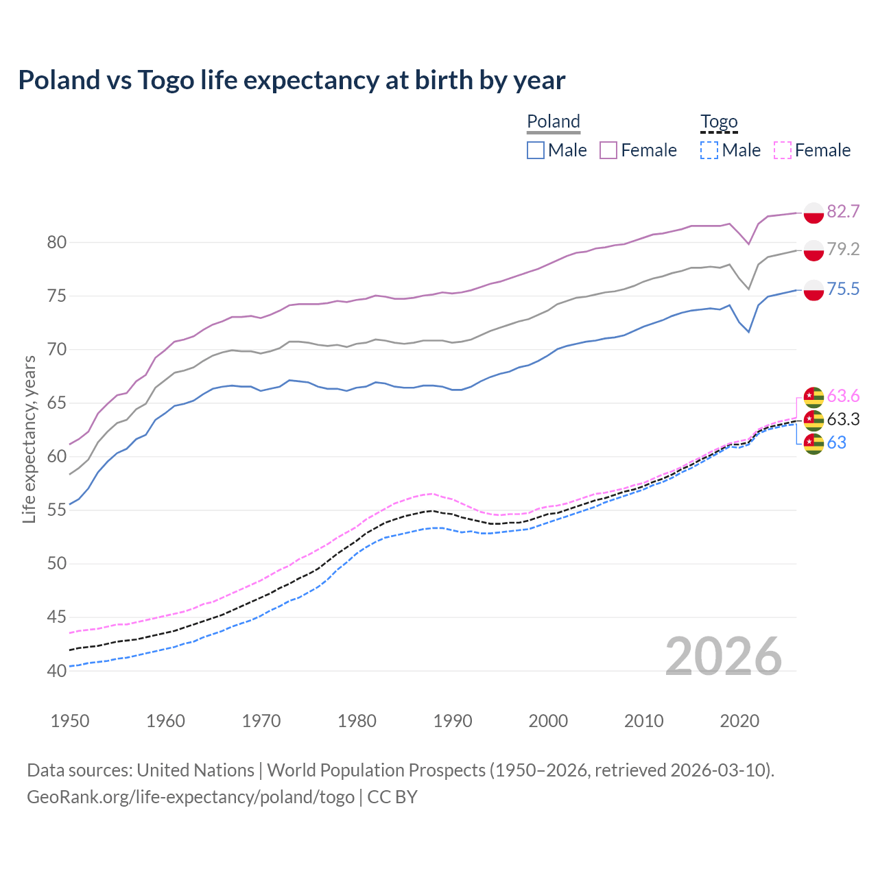 The average life expectancy at birth is 79.2 years in Poland vs 63.3 in Togo. Poland is ranked 50/197 by life expectancy, and Togo is 181/197. In Poland, the life expectancy is 75.5 years for males and 82.7 years for females. In Togo, it's 63 years for males and 63.6 years for females.