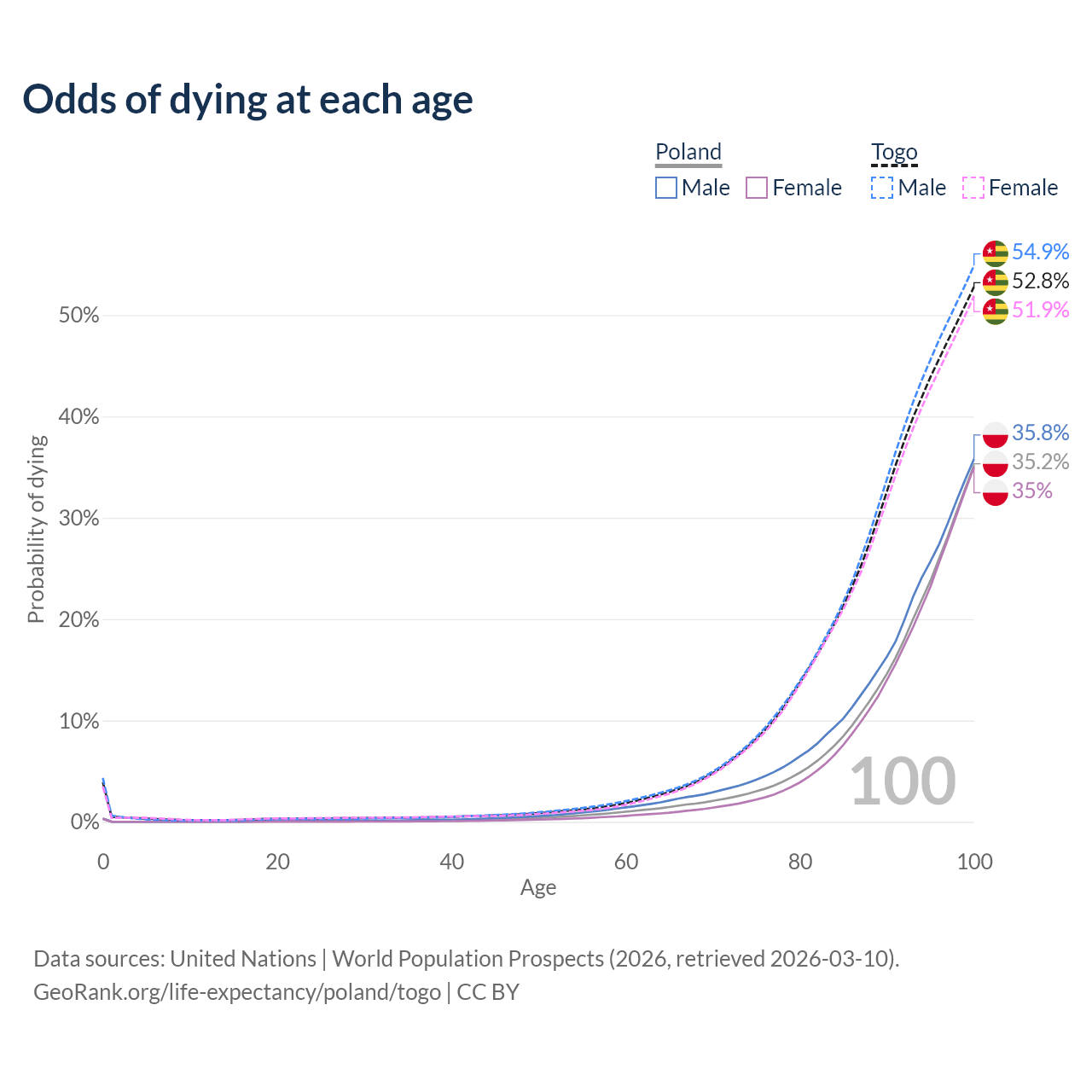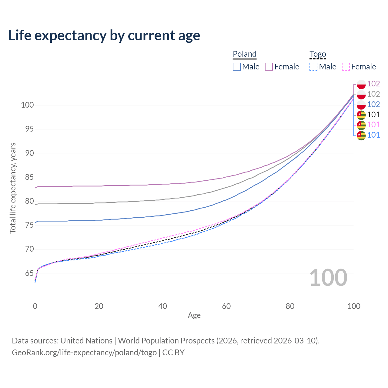 This life expectancy calculator shows the odds of living to 100, 95, 90, and below based on current age for both males and females in Poland and Togo, along with mean and median age of death. The calculations are based on the 2026 life tables (actuarial tables) from the UN World Population Prospects.