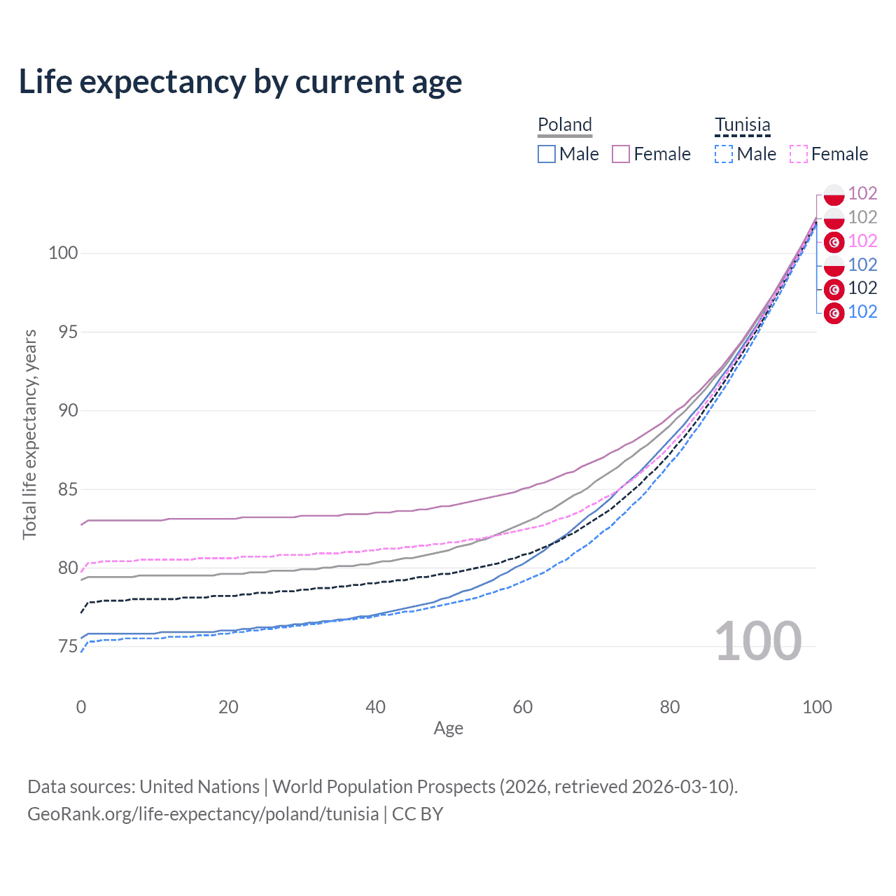 This life expectancy calculator shows the odds of living to 100, 95, 90, and below based on current age for both males and females in Poland and Tunisia, along with mean and median age of death. The calculations are based on the 2026 life tables (actuarial tables) from the UN World Population Prospects.