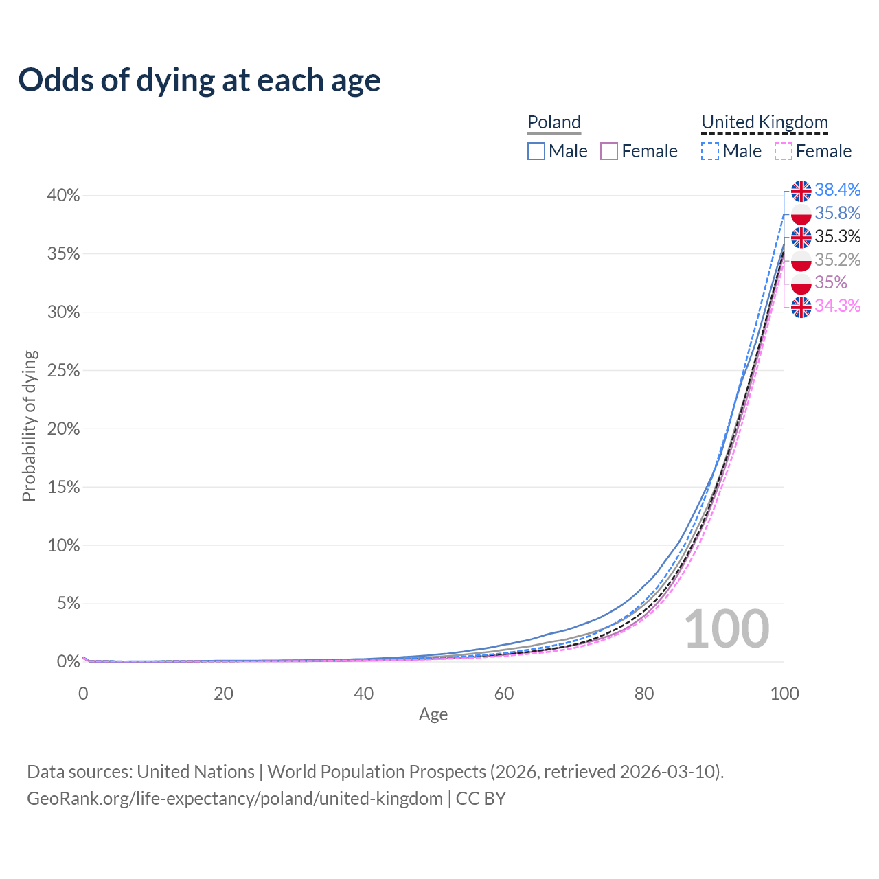 This life expectancy calculator shows the odds of living to 100, 95, 90, and below based on current age for both males and females in Poland and the United Kingdom, along with mean and median age of death. The calculations are based on the 2026 life tables (actuarial tables) from the UN World Population Prospects.