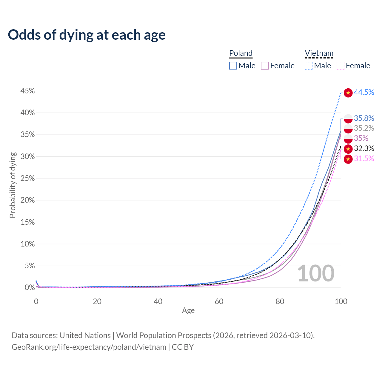 This life expectancy calculator shows the odds of living to 100, 95, 90, and below based on current age for both males and females in Poland and Vietnam, along with mean and median age of death. The calculations are based on the 2026 life tables (actuarial tables) from the UN World Population Prospects.