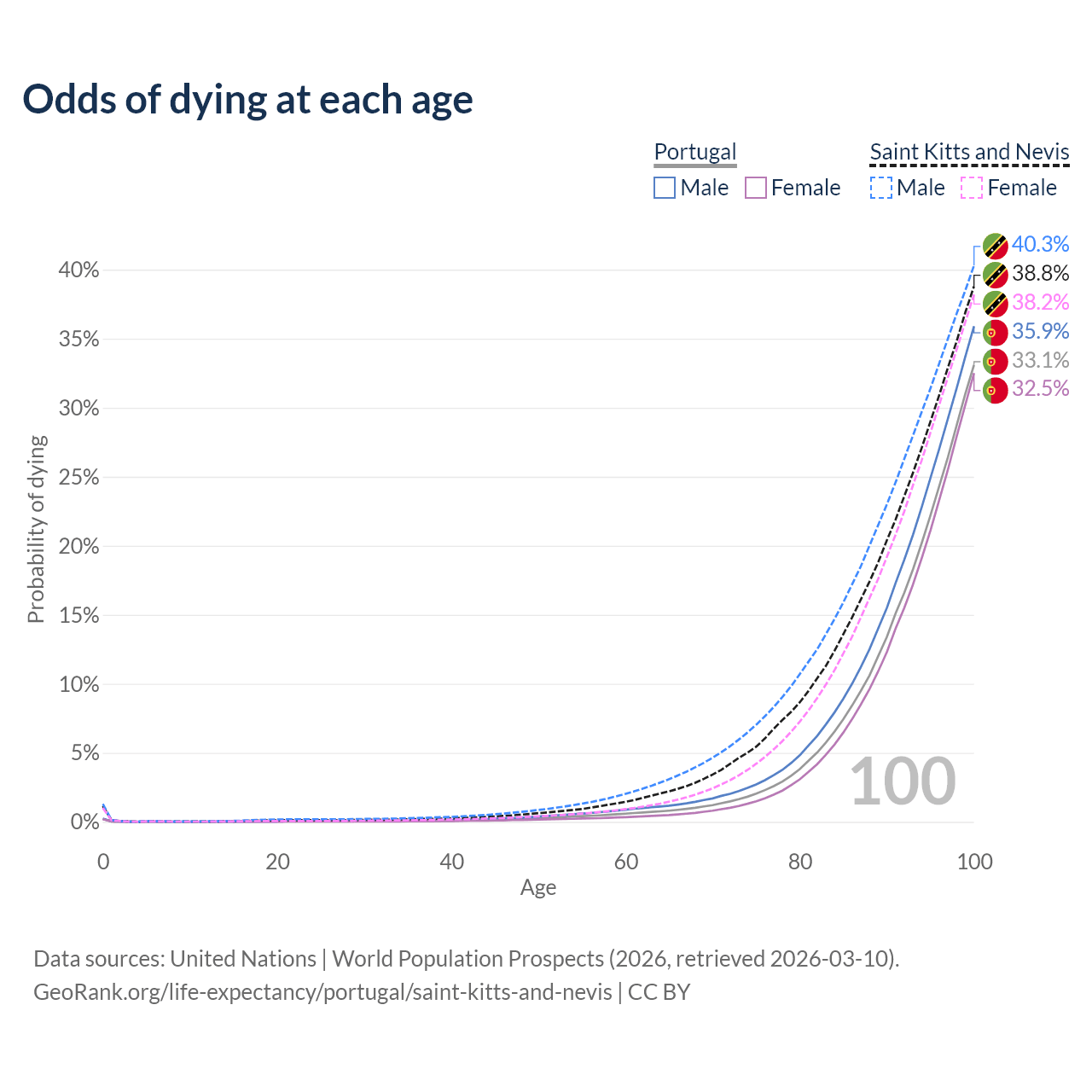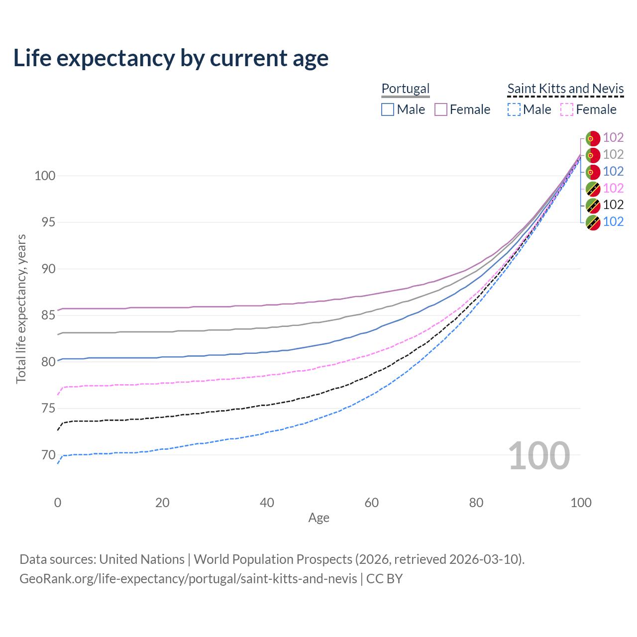 This life expectancy calculator shows the odds of living to 100, 95, 90, and below based on current age for both males and females in Portugal and Saint Kitts and Nevis, along with mean and median age of death. The calculations are based on the 2026 life tables (actuarial tables) from the UN World Population Prospects.