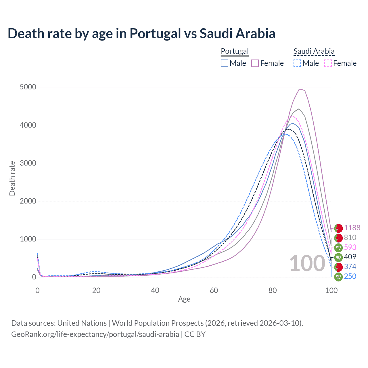In Portugal, the most common age of death is 89, compared to 85 in Saudi Arabia. The median age of death is 85.9 in Portugal and 82.5 in Saudi Arabia, meaning only half of each cohort is expected to live past that age.