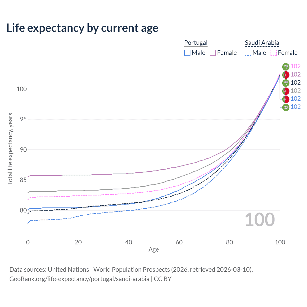 This life expectancy calculator shows the odds of living to 100, 95, 90, and below based on current age for both males and females in Portugal and Saudi Arabia, along with mean and median age of death. The calculations are based on the 2026 life tables (actuarial tables) from the UN World Population Prospects.