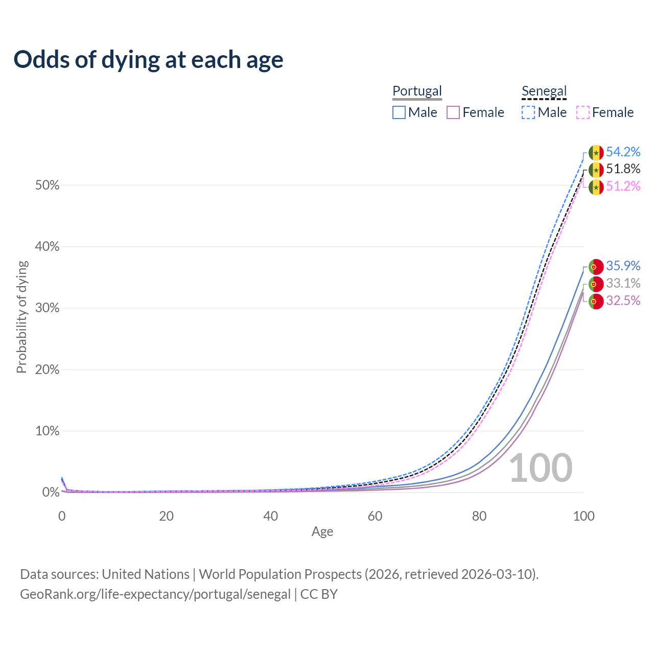 This life expectancy calculator shows the odds of living to 100, 95, 90, and below based on current age for both males and females in Portugal and Senegal, along with mean and median age of death. The calculations are based on the 2026 life tables (actuarial tables) from the UN World Population Prospects.