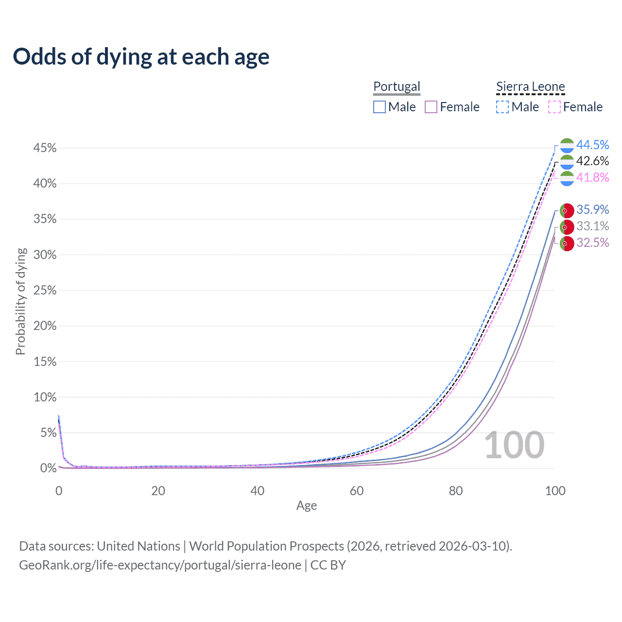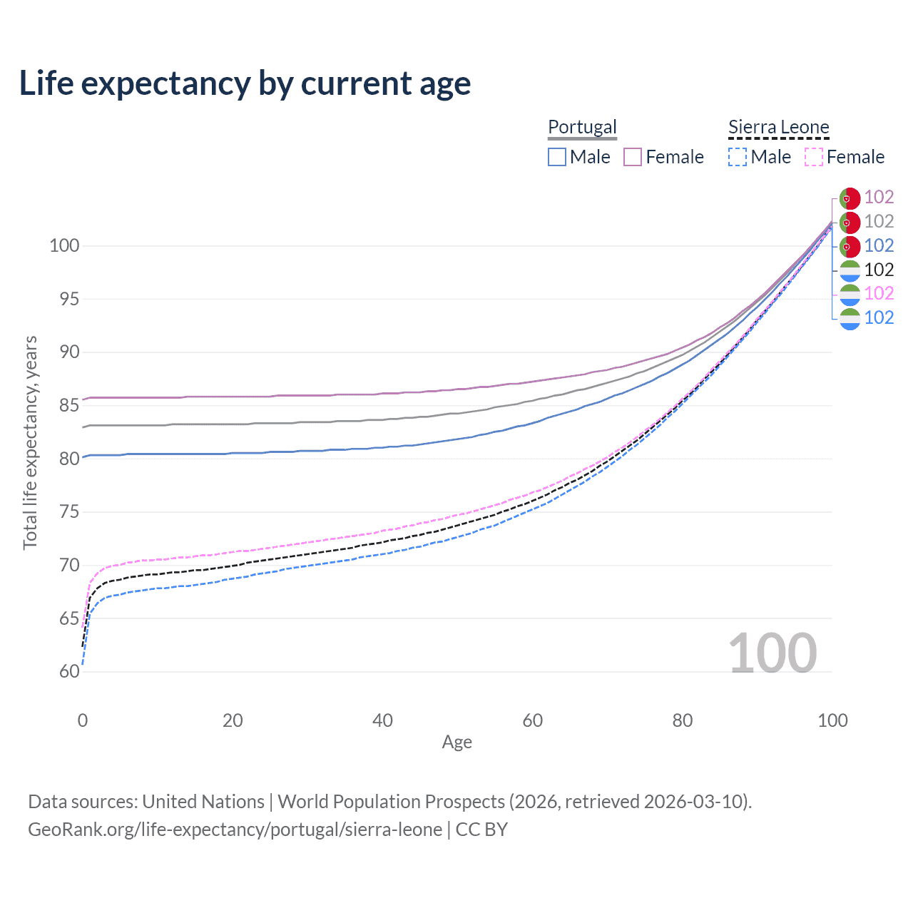 This life expectancy calculator shows the odds of living to 100, 95, 90, and below based on current age for both males and females in Portugal and Sierra Leone, along with mean and median age of death. The calculations are based on the 2026 life tables (actuarial tables) from the UN World Population Prospects.