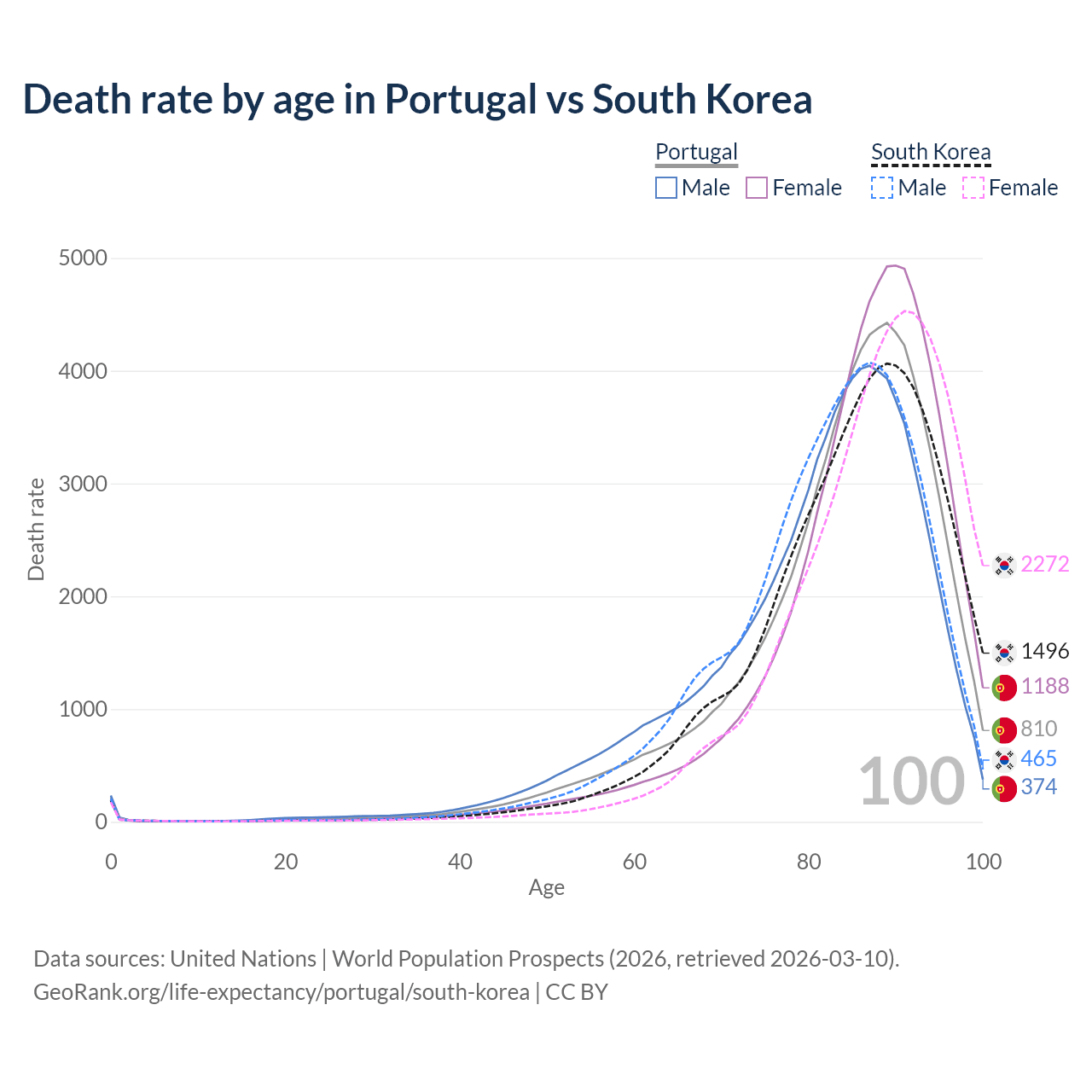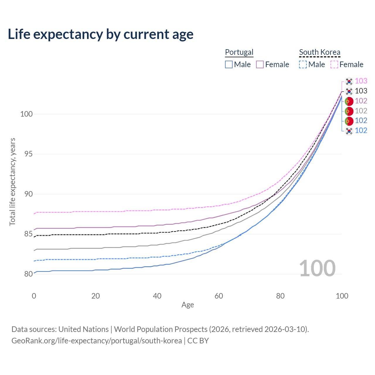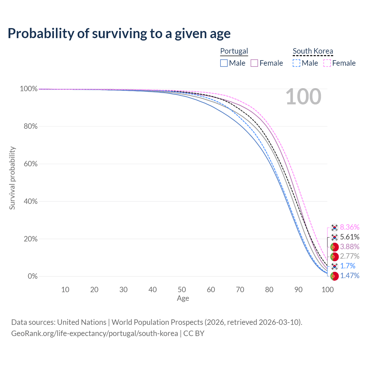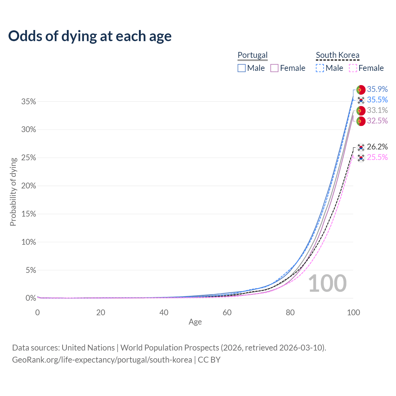 This life expectancy calculator shows the odds of living to 100, 95, 90, and below based on current age for both males and females in Portugal and South Korea, along with mean and median age of death. The calculations are based on the 2026 life tables (actuarial tables) from the UN World Population Prospects.