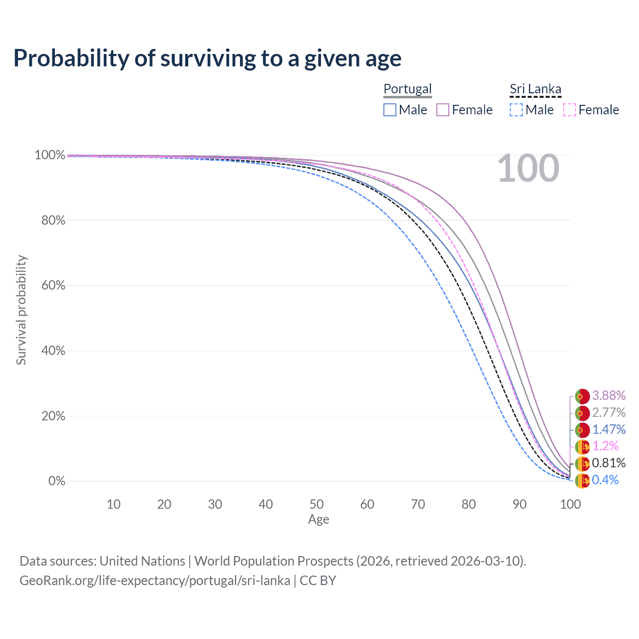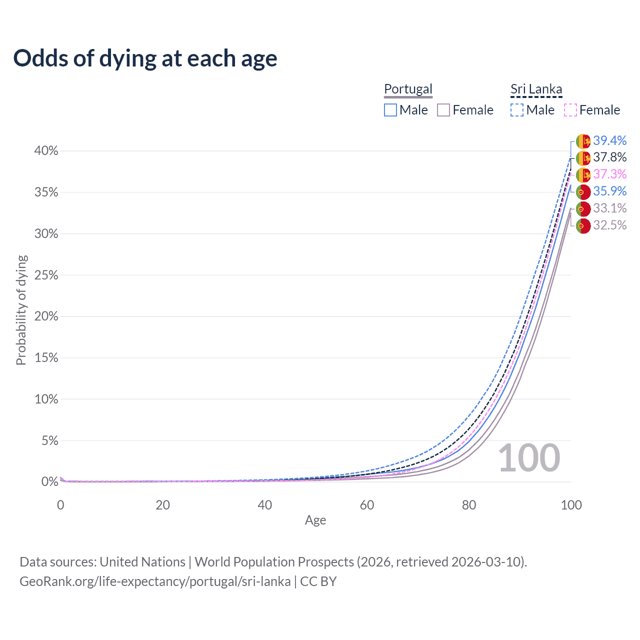 This life expectancy calculator shows the odds of living to 100, 95, 90, and below based on current age for both males and females in Portugal and Sri Lanka, along with mean and median age of death. The calculations are based on the 2026 life tables (actuarial tables) from the UN World Population Prospects.