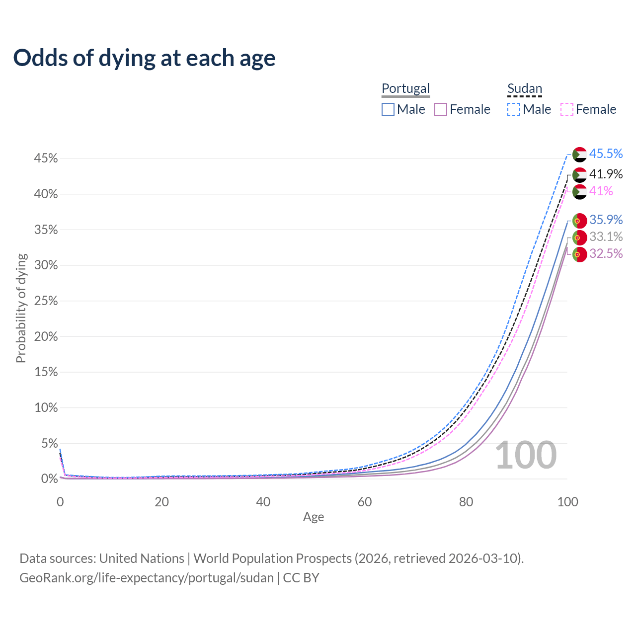 This life expectancy calculator shows the odds of living to 100, 95, 90, and below based on current age for both males and females in Portugal and Sudan, along with mean and median age of death. The calculations are based on the 2026 life tables (actuarial tables) from the UN World Population Prospects.