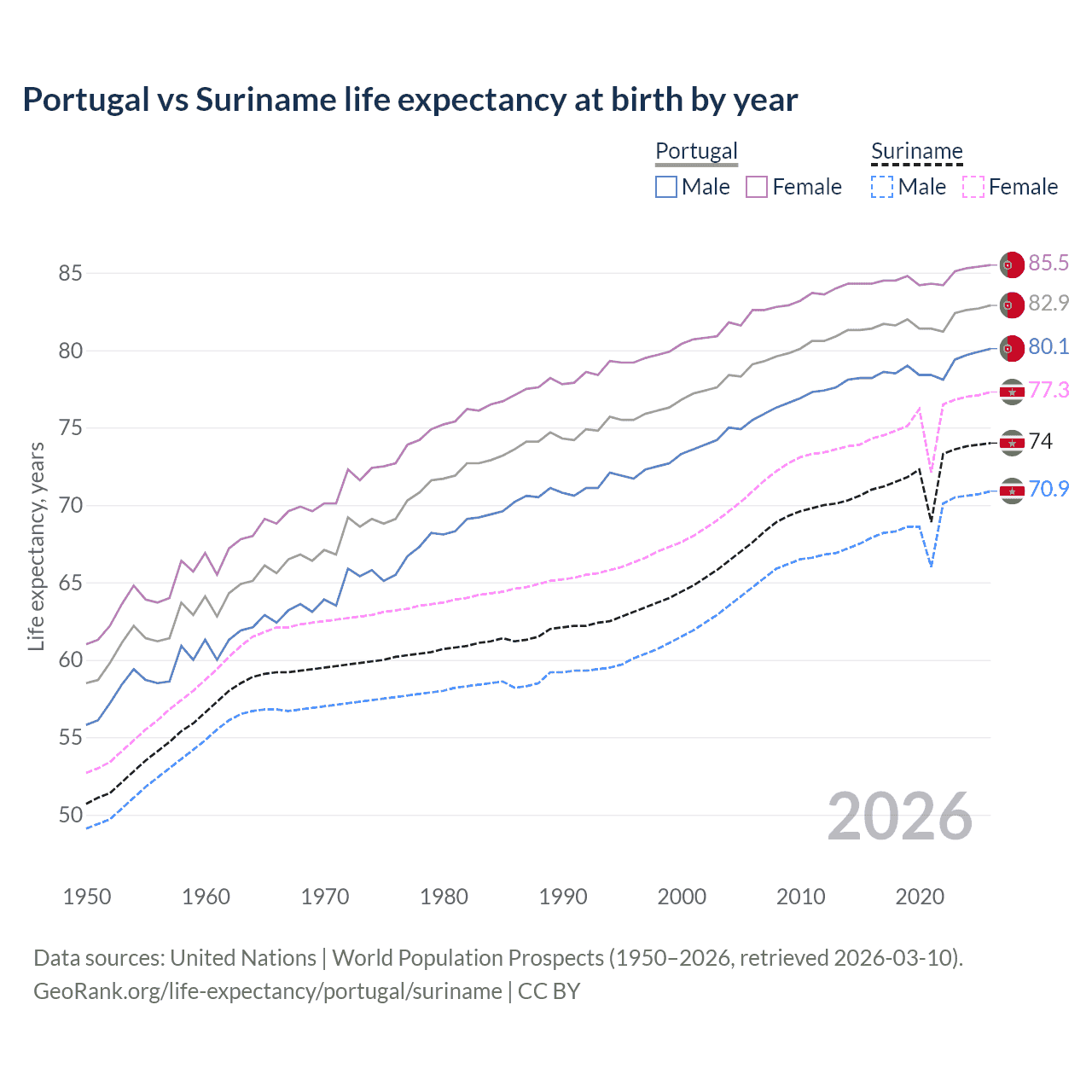 The average life expectancy at birth is 82.9 years in Portugal vs 74 in Suriname. Portugal is ranked 22/197 by life expectancy, and Suriname is 103/197. In Portugal, the life expectancy is 80.1 years for males and 85.5 years for females. In Suriname, it's 70.9 years for males and 77.3 years for females.