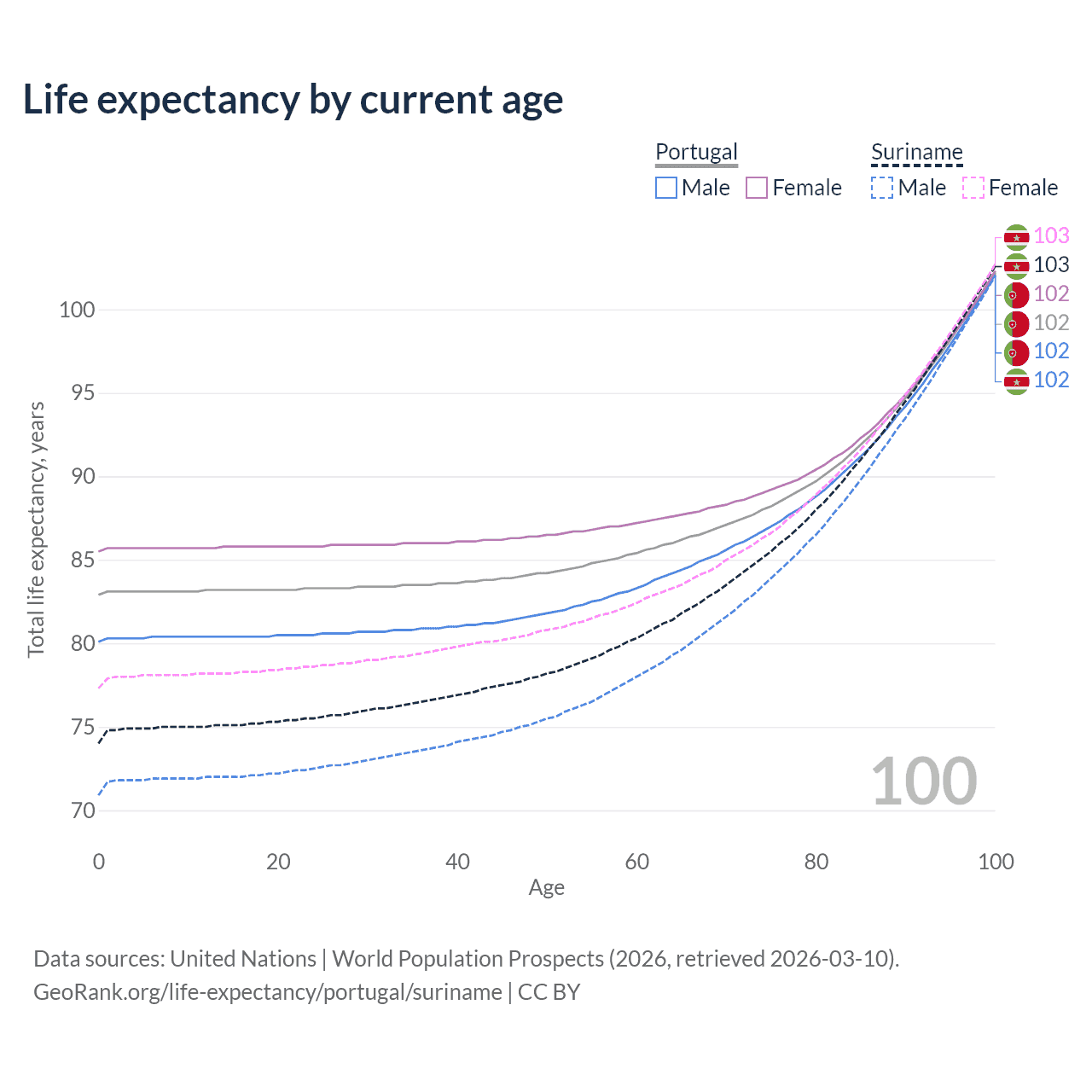 This life expectancy calculator shows the odds of living to 100, 95, 90, and below based on current age for both males and females in Portugal and Suriname, along with mean and median age of death. The calculations are based on the 2026 life tables (actuarial tables) from the UN World Population Prospects.