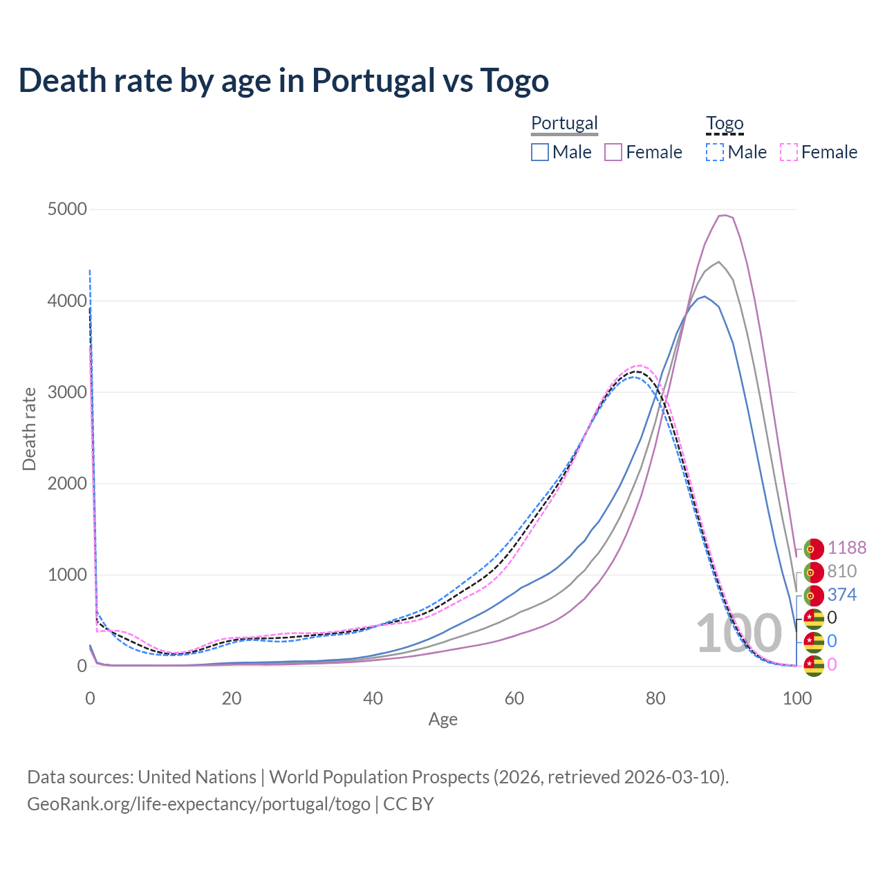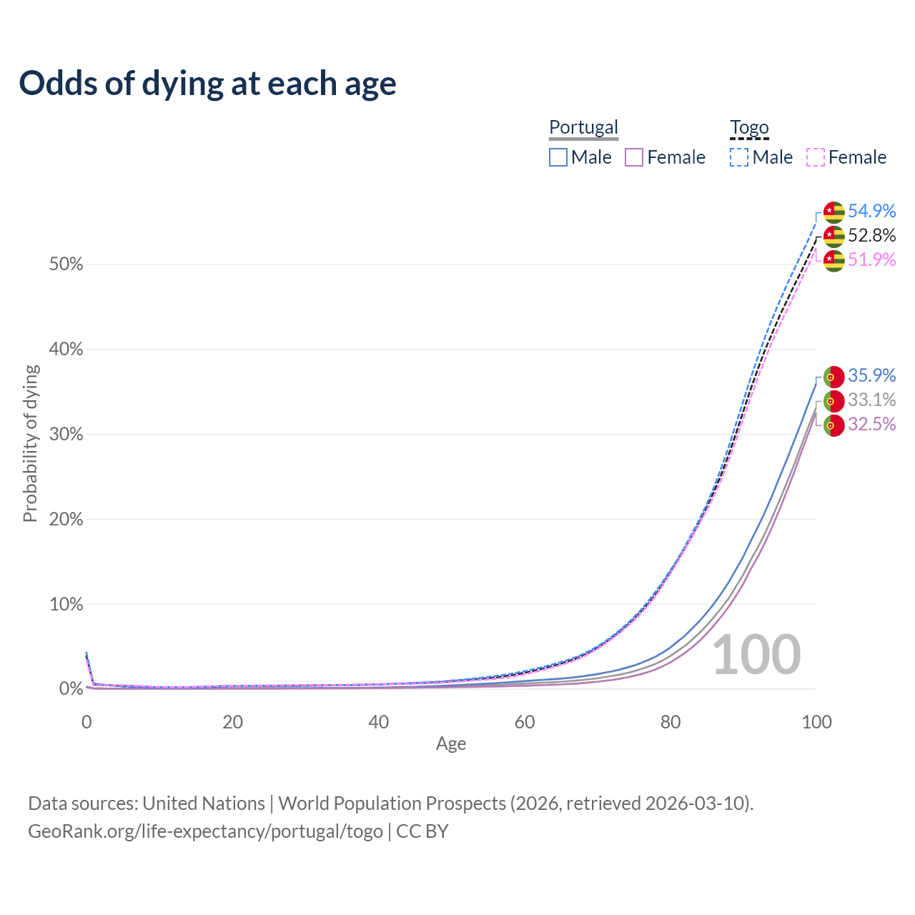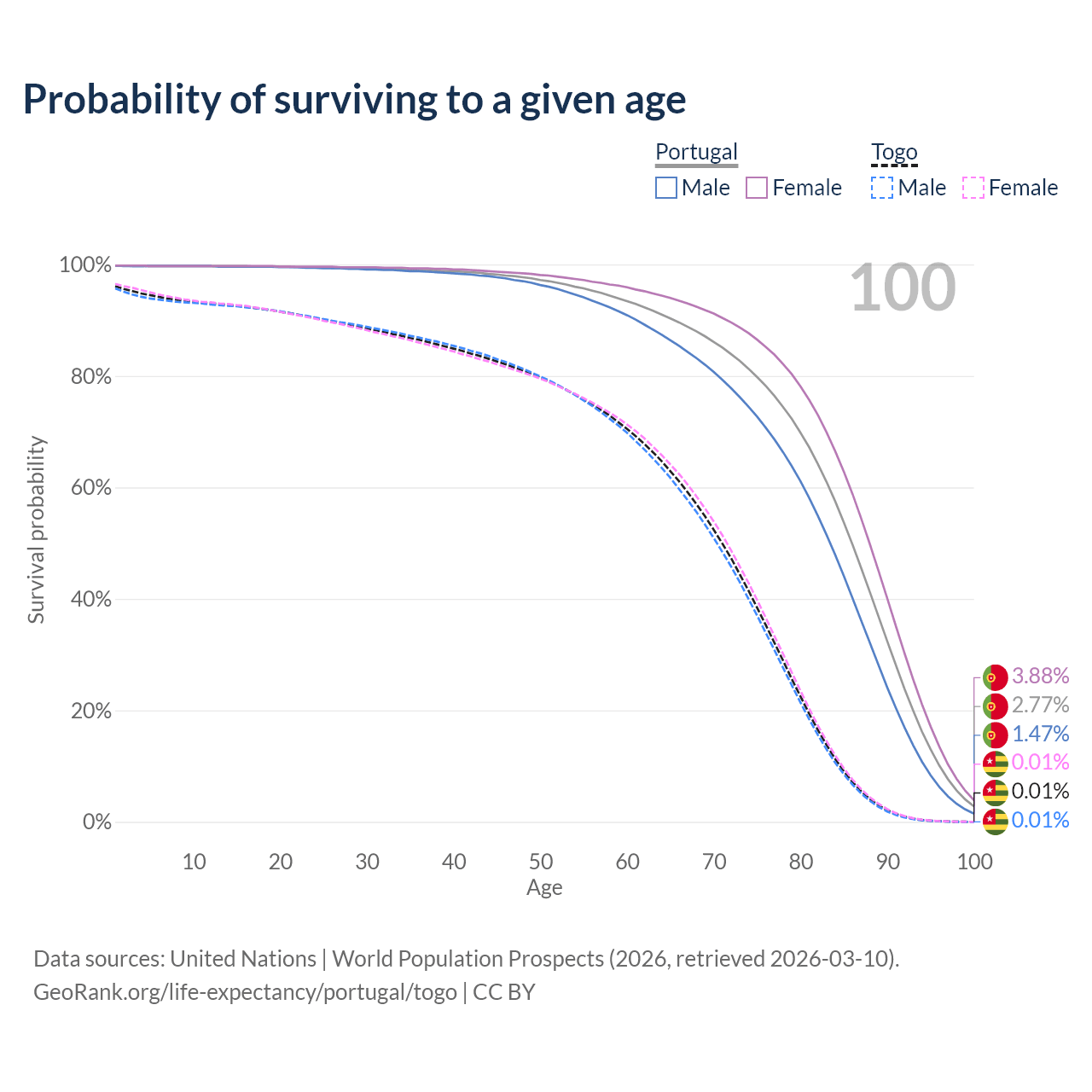 This life expectancy calculator shows the odds of living to 100, 95, 90, and below based on current age for both males and females in Portugal and Togo, along with mean and median age of death. The calculations are based on the 2026 life tables (actuarial tables) from the UN World Population Prospects.