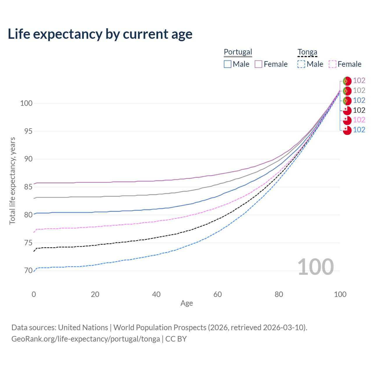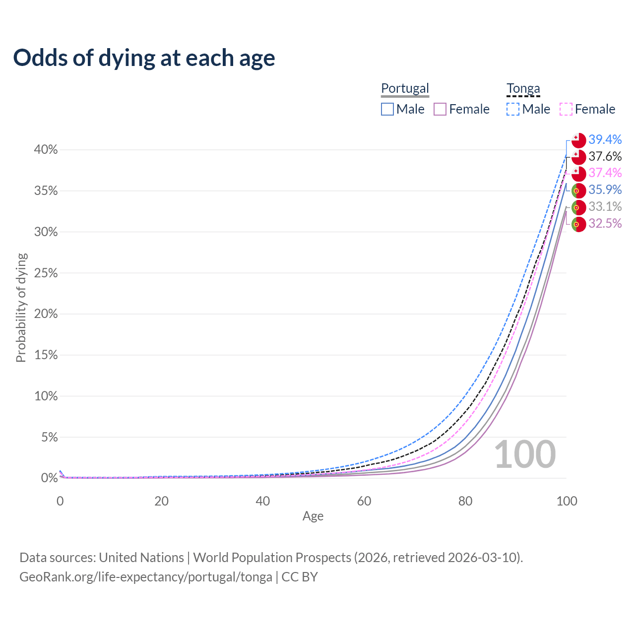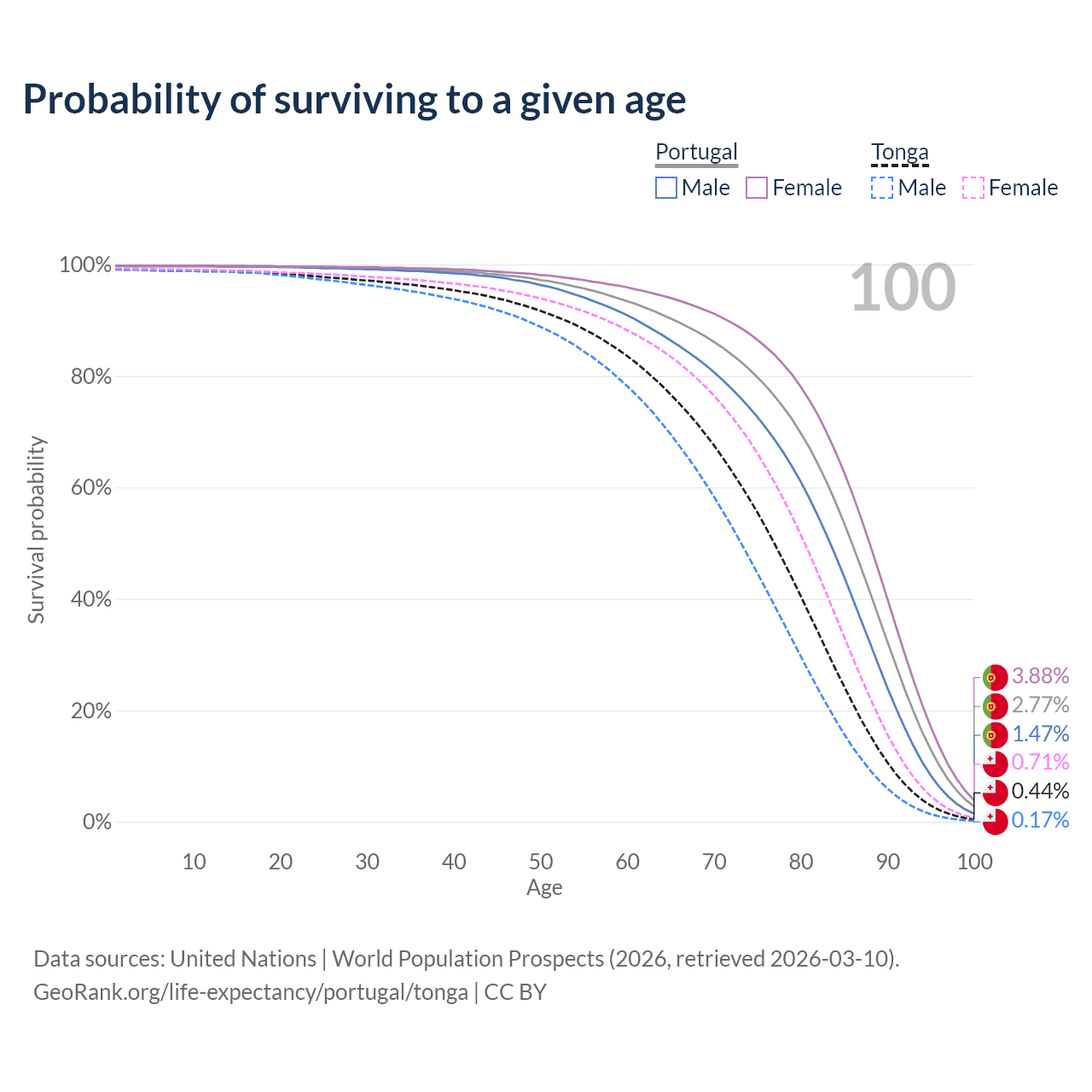 This life expectancy calculator shows the odds of living to 100, 95, 90, and below based on current age for both males and females in Portugal and Tonga, along with mean and median age of death. The calculations are based on the 2026 life tables (actuarial tables) from the UN World Population Prospects.