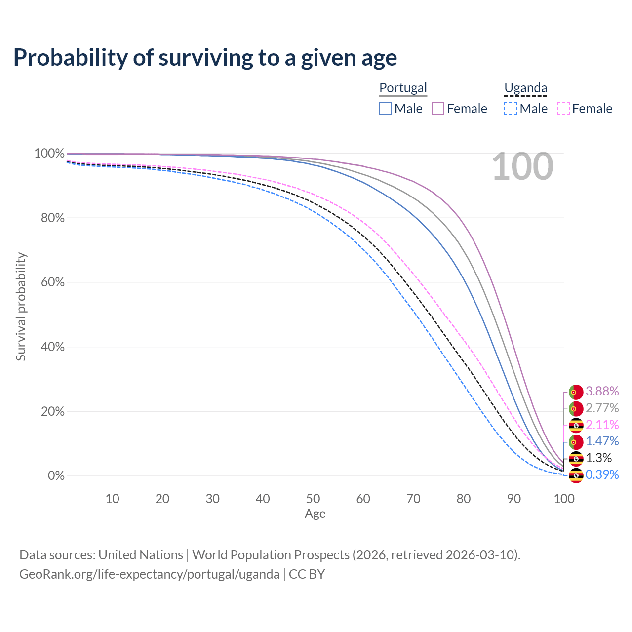 This life expectancy calculator shows the odds of living to 100, 95, 90, and below based on current age for both males and females in Portugal and Uganda, along with mean and median age of death. The calculations are based on the 2026 life tables (actuarial tables) from the UN World Population Prospects.