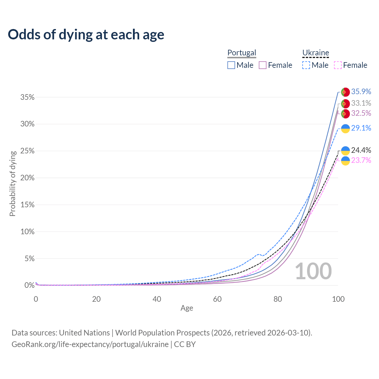 This life expectancy calculator shows the odds of living to 100, 95, 90, and below based on current age for both males and females in Portugal and Ukraine, along with mean and median age of death. The calculations are based on the 2026 life tables (actuarial tables) from the UN World Population Prospects.