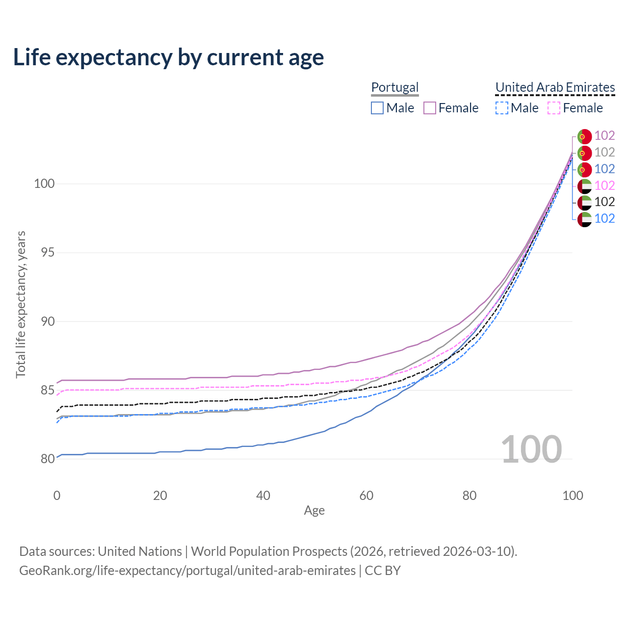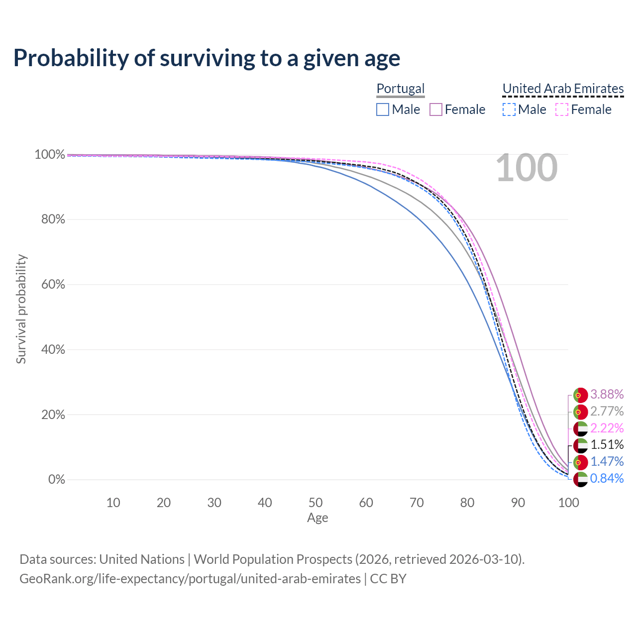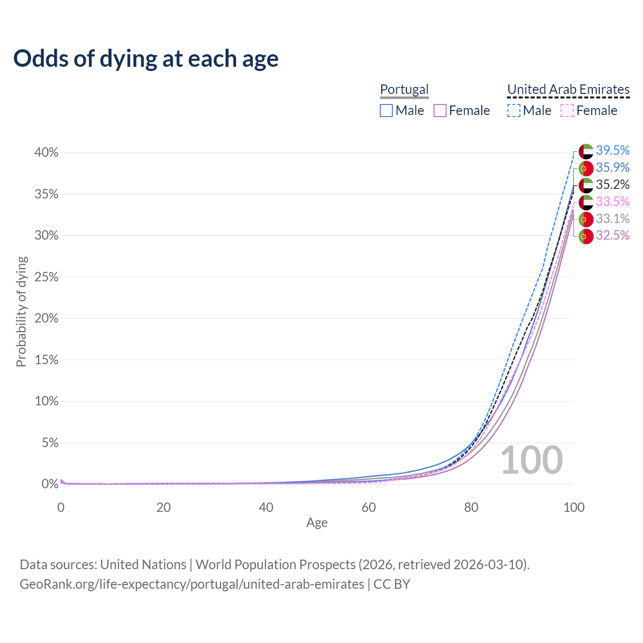 This life expectancy calculator shows the odds of living to 100, 95, 90, and below based on current age for both males and females in Portugal and the United Arab Emirates, along with mean and median age of death. The calculations are based on the 2026 life tables (actuarial tables) from the UN World Population Prospects.