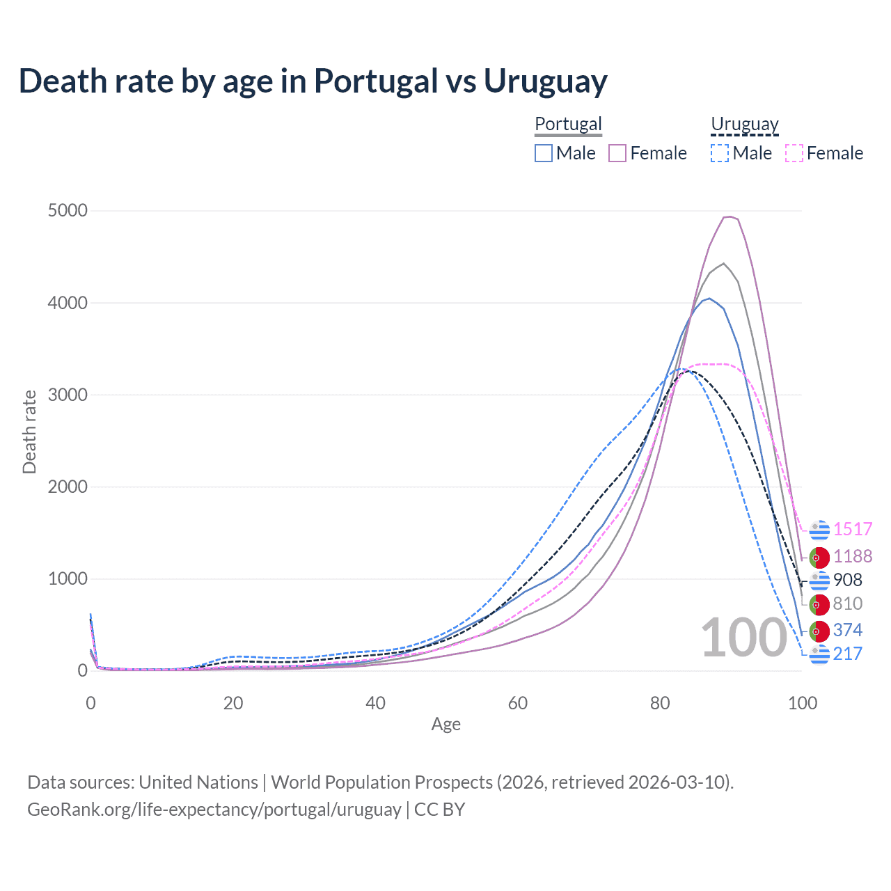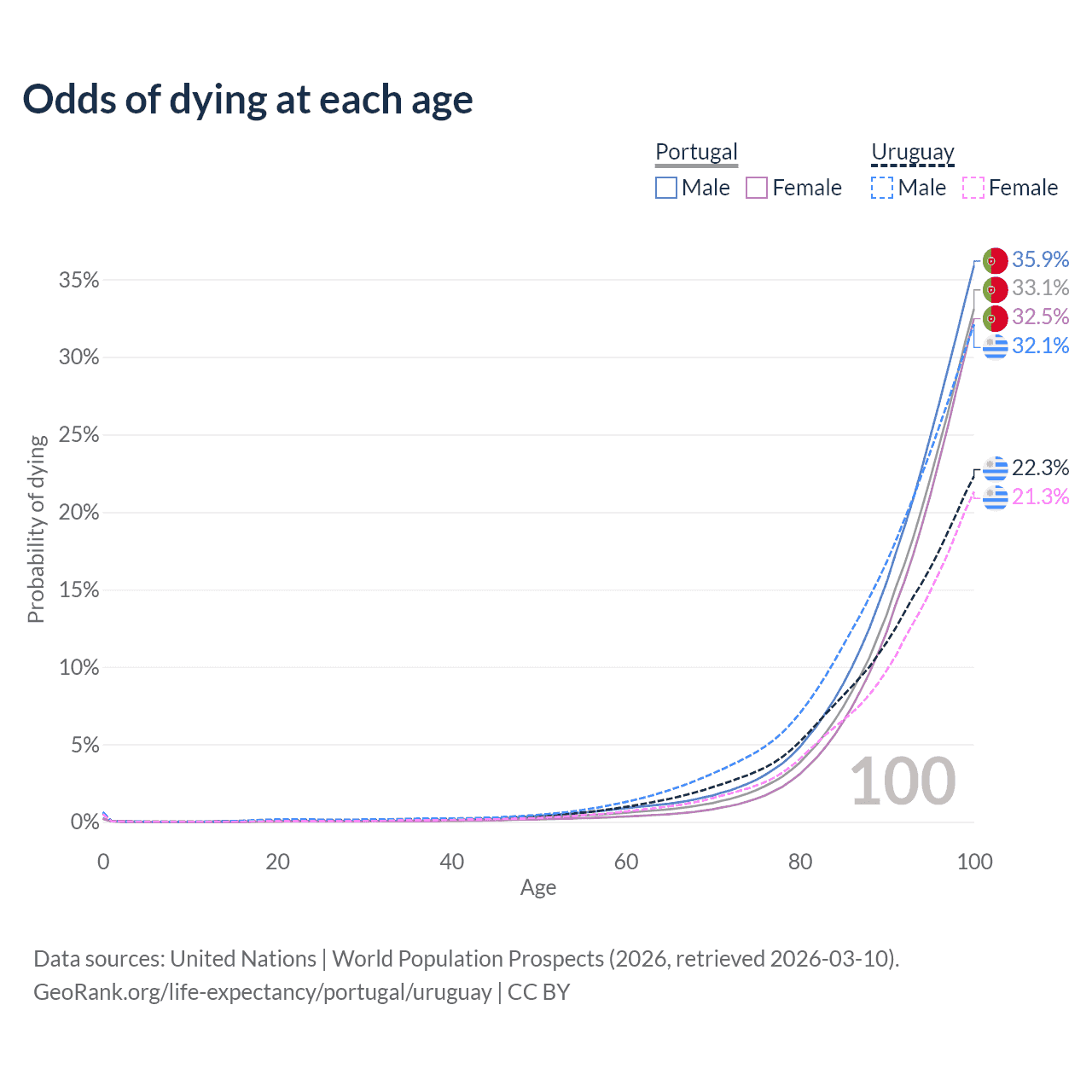 This life expectancy calculator shows the odds of living to 100, 95, 90, and below based on current age for both males and females in Portugal and Uruguay, along with mean and median age of death. The calculations are based on the 2026 life tables (actuarial tables) from the UN World Population Prospects.