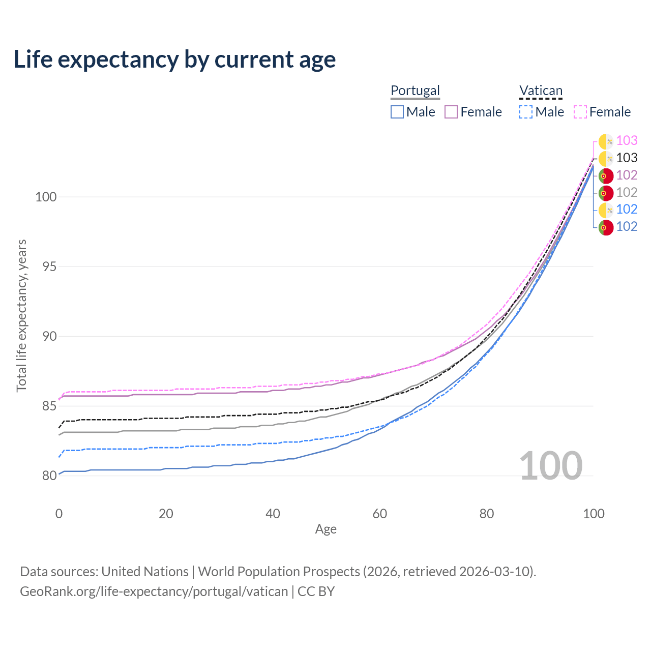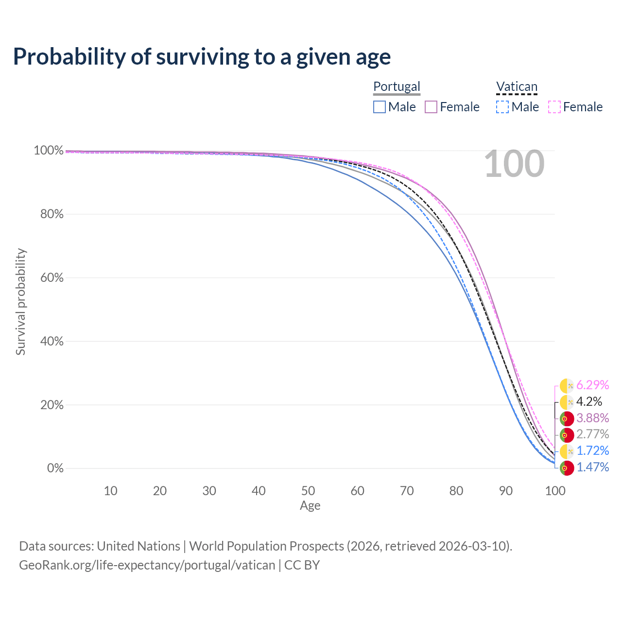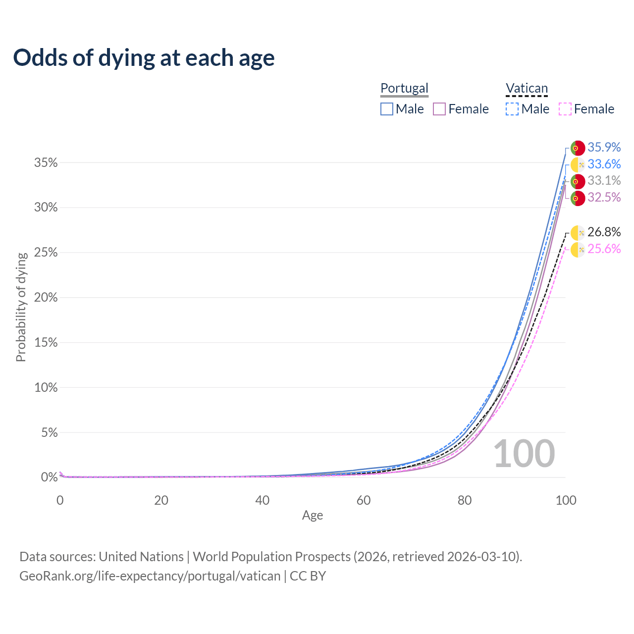 This life expectancy calculator shows the odds of living to 100, 95, 90, and below based on current age for both males and females in Portugal and the Vatican, along with mean and median age of death. The calculations are based on the 2026 life tables (actuarial tables) from the UN World Population Prospects.