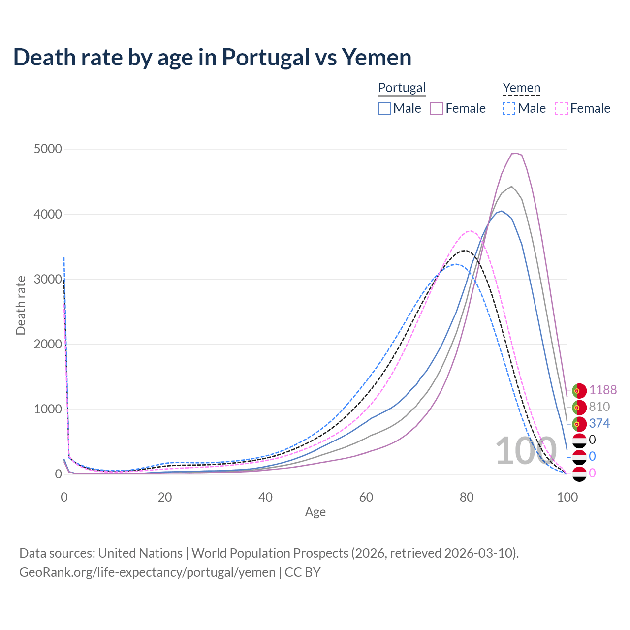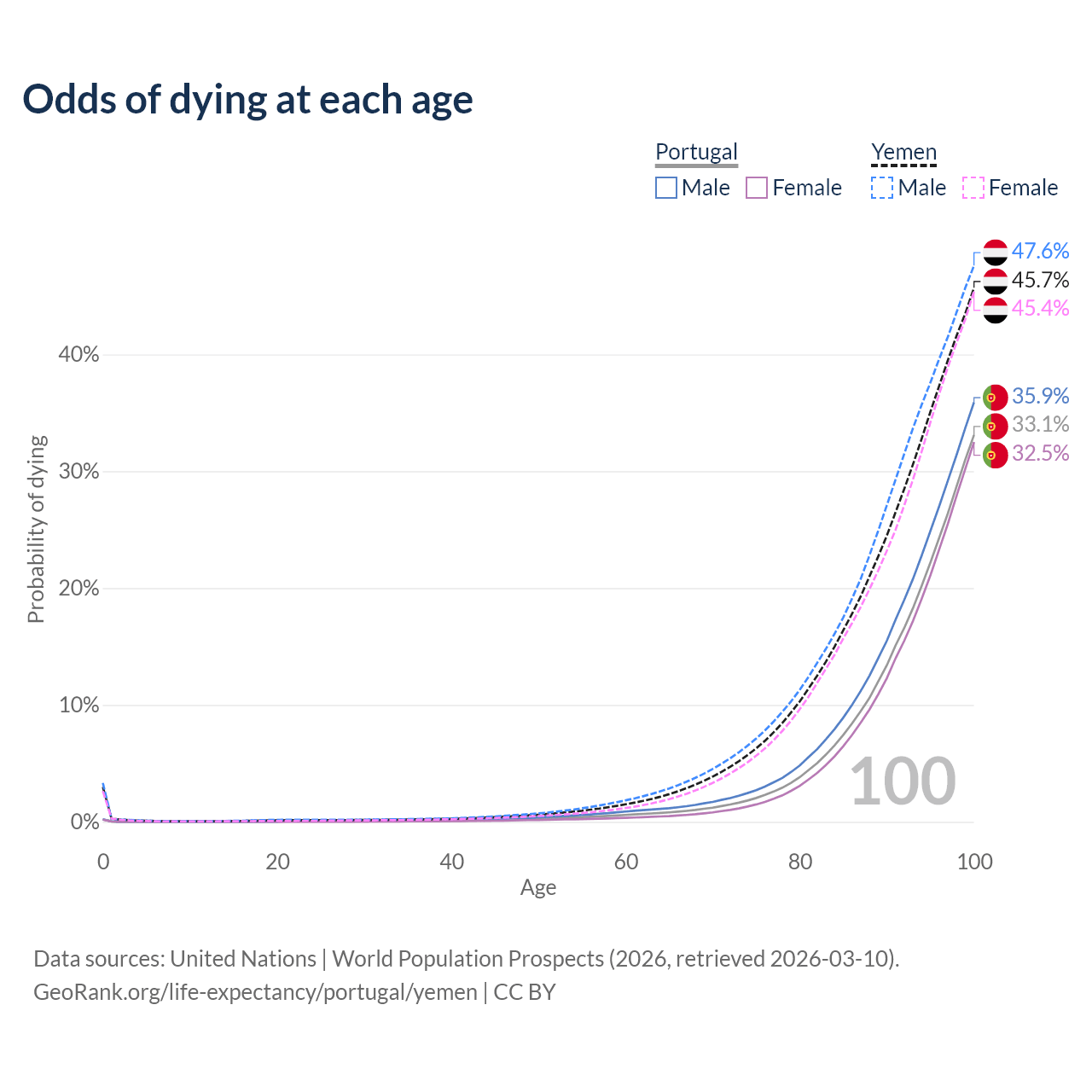 This life expectancy calculator shows the odds of living to 100, 95, 90, and below based on current age for both males and females in Portugal and Yemen, along with mean and median age of death. The calculations are based on the 2026 life tables (actuarial tables) from the UN World Population Prospects.